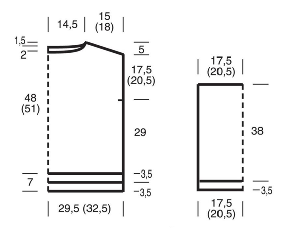 Для более глубокого выреза горловины уже через 48 см 134 ряда (51 см 142 ряда) от планки закрыть средние 44 п., затем в каждом 2-м ряду закрыть 1 х 3 п., 1 х 2 п. и 2 х 1 п.
