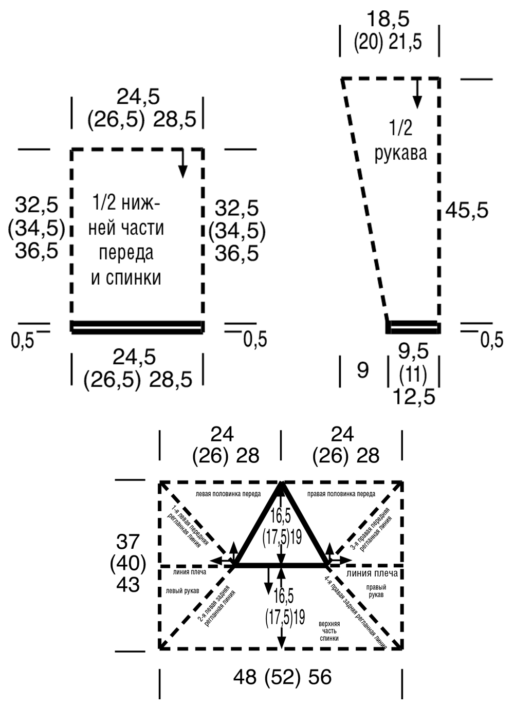 Изделие вяжется сверху вниз как единая деталь сначала рядами в прямом и обратном направлении, затем — по кругу. Стрелками на чертеже деталей выкройки обозначено направление вязания. Из-за сложности изображения каждая деталь приведена отдельно.
