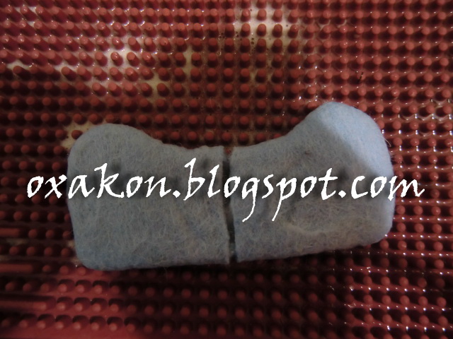 Когда чувствуем, что шаблон становится великоват нашему валеночку (вернее, двум валеночкам), то аккуратно маленькими ножницами с острыми кончиками надрезаем шерсть по середине шаблона. Если в дальнейшем этот шаблон не понадобится - можно смело резать валенок вместе с шаблоном пополам.