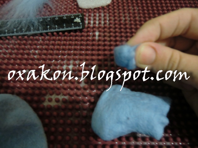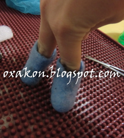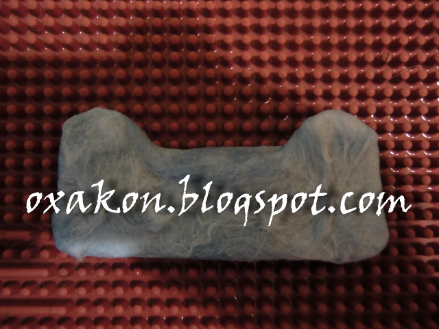 Начинаем его валять - гладить о пупырку (я об коврик), сначала легонько, потом сильнее тереть, потом можно даже мять у руках, когда шерсть достаточно крепко сцепится между собой. Получается более-менее ровный валеночек, на нем не видно отдельных волокон шерсти.