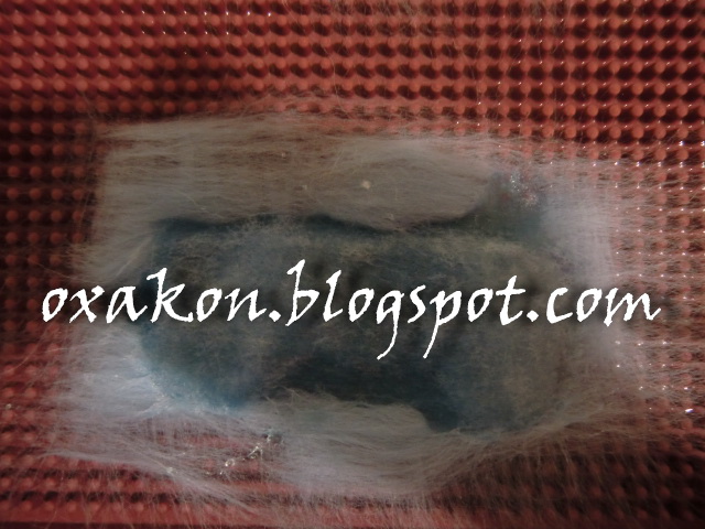 Аккуратно дастаем шаблон из валеночков. Одеваем валенки на пальцы (или тушь, ручка...) и начинаем тереть всеми поверхностями руками, об пленку. Можно покидать его, чтобы быстрее увалялся. Иногда (но не всегда) я вставляю в носочек валеночка кусочек шерсти, чтобы носок меньше сминался, но это не значимо.