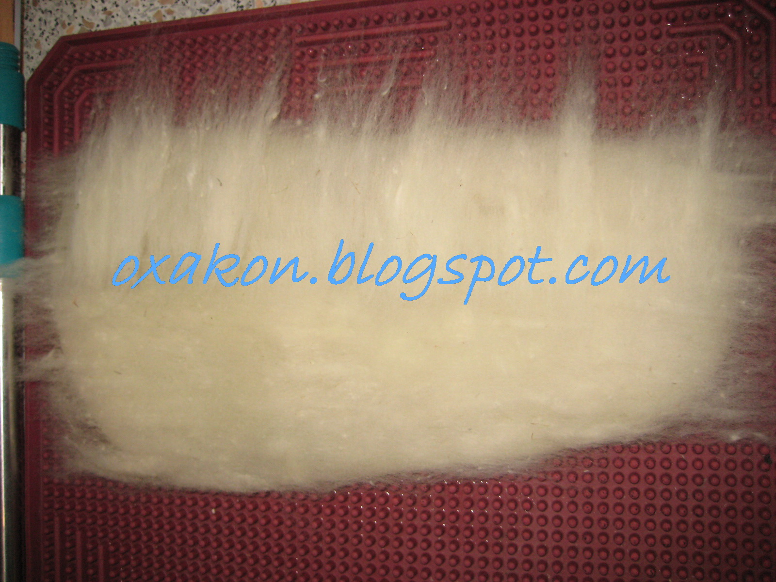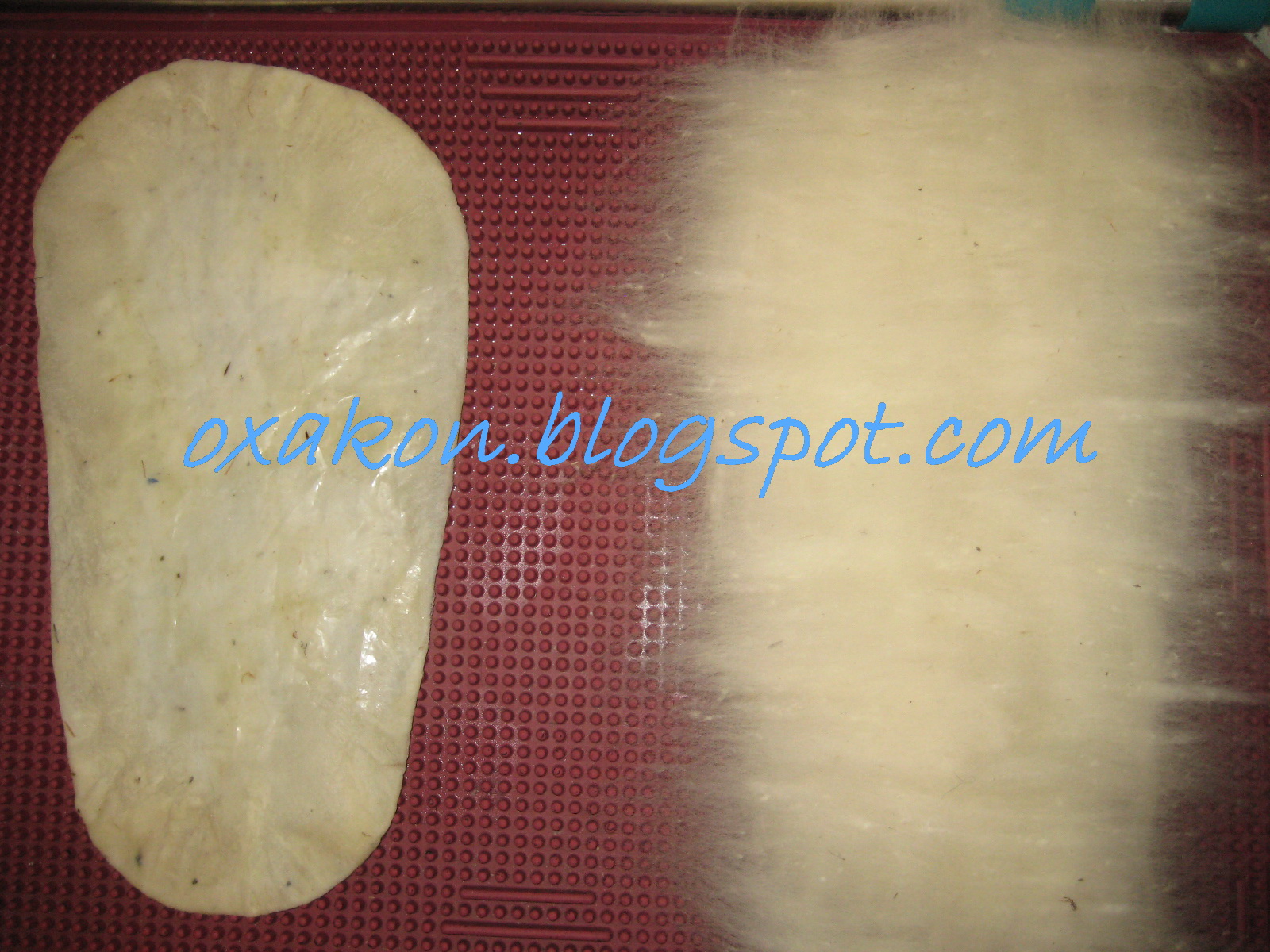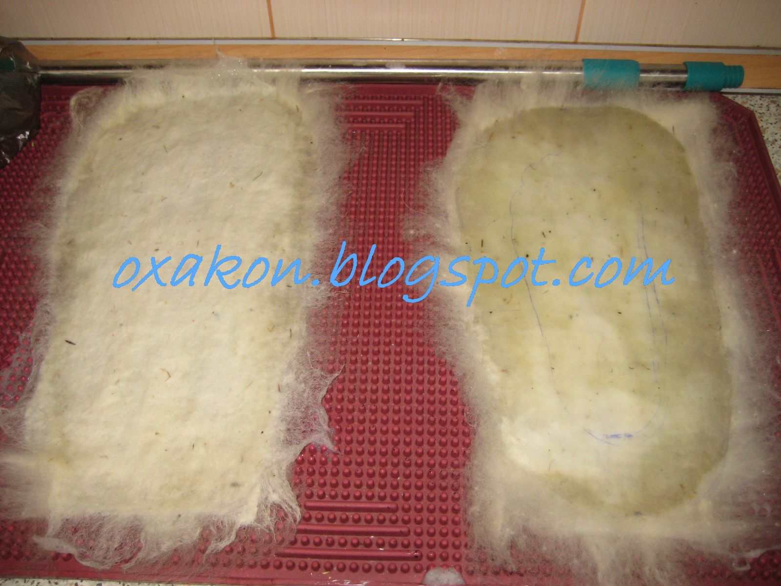 3. По раскладке - все количество шерсти я делю сначала на 2 части (на 2 тапка), а потом каждую часть делю еще на 2 неравноценные доли: одна чуть поменьше - на верх тапочка, и вторая чуть побольше - на низ тапочка. Так проще ориентироваться, а то я валяю с большими перерывами - малышня никогда не дает заняться и не отвлекаться. И сразу раскладывать надо 2 тапка, иначе тоже раскладка может быть разной (ну может у супер-профессионалов и не так, у них руки и глаза уже "набиты")