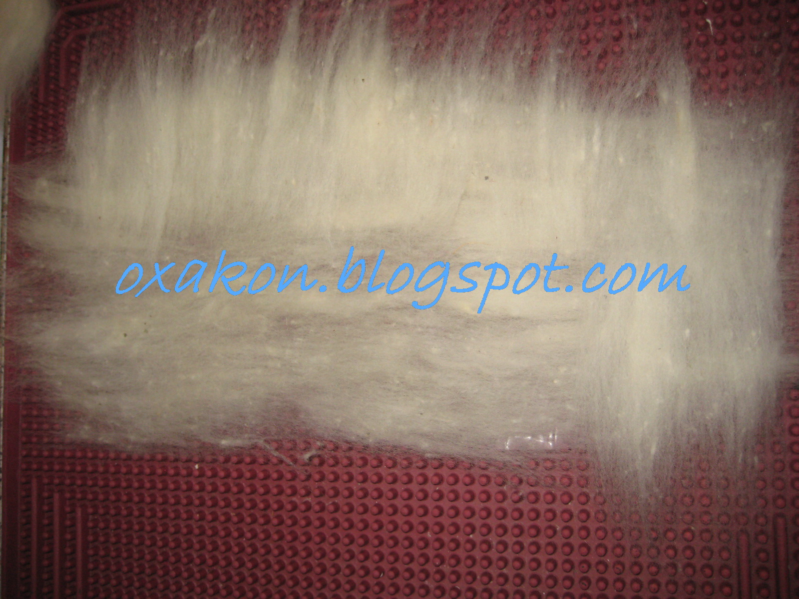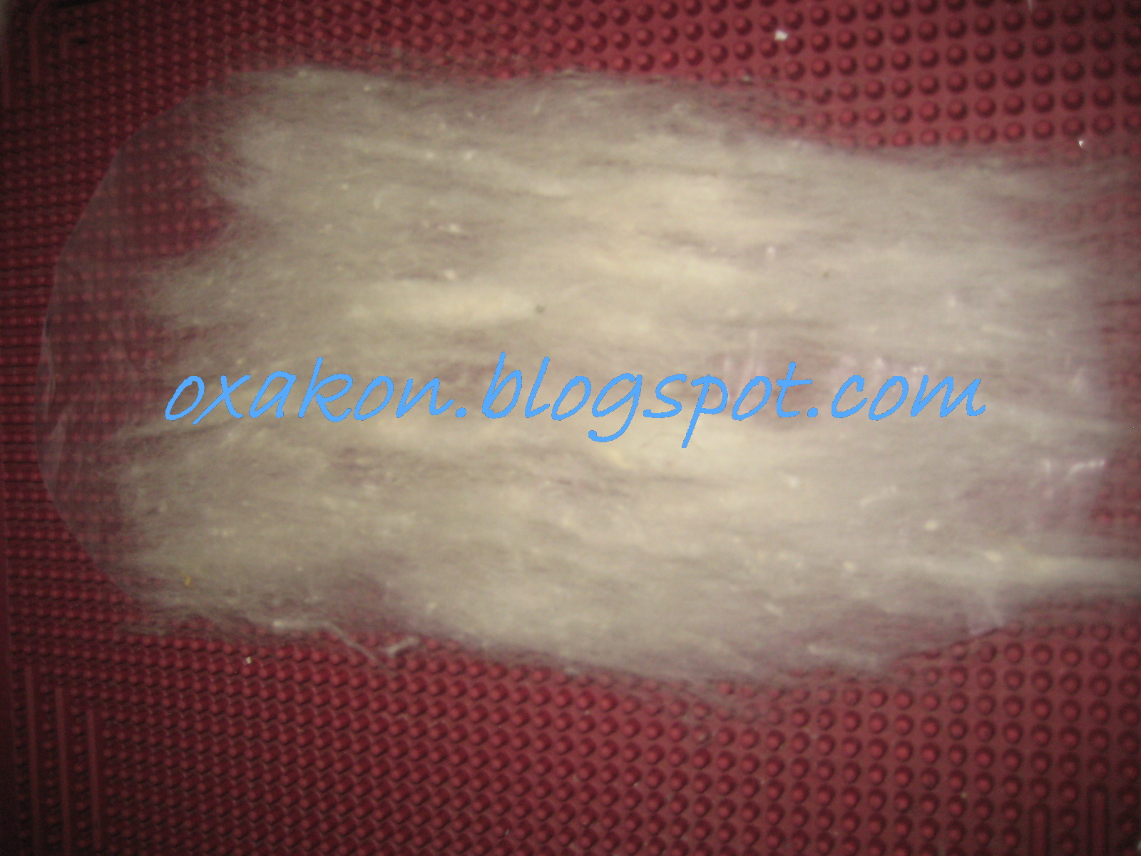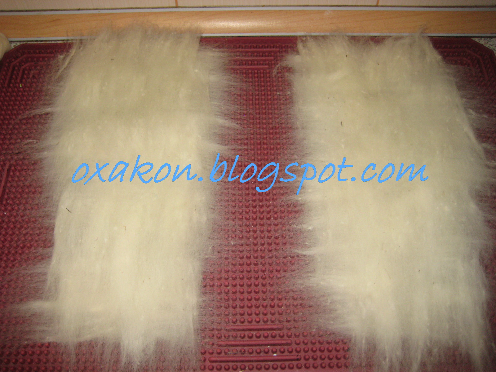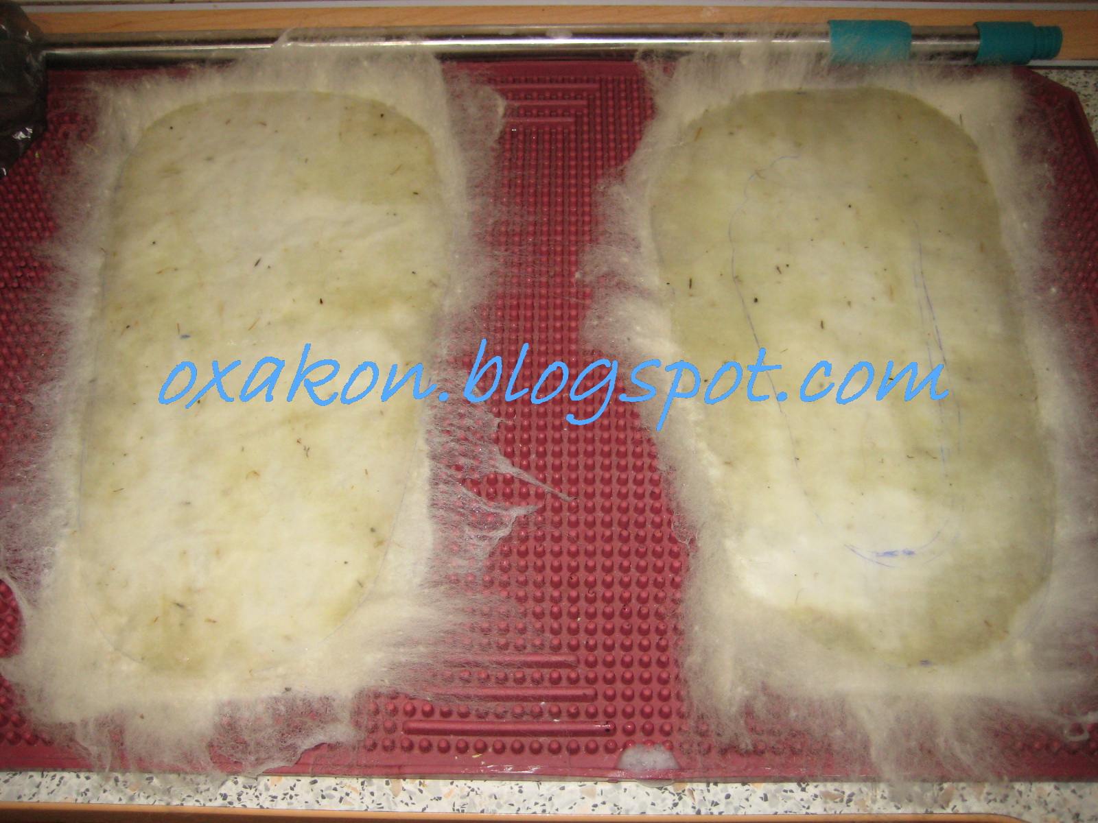 3. По раскладке - все количество шерсти я делю сначала на 2 части (на 2 тапка), а потом каждую часть делю еще на 2 неравноценные доли: одна чуть поменьше - на верх тапочка, и вторая чуть побольше - на низ тапочка. Так проще ориентироваться, а то я валяю с большими перерывами - малышня никогда не дает заняться и не отвлекаться. И сразу раскладывать надо 2 тапка, иначе тоже раскладка может быть разной (ну может у супер-профессионалов и не так, у них руки и глаза уже "набиты")