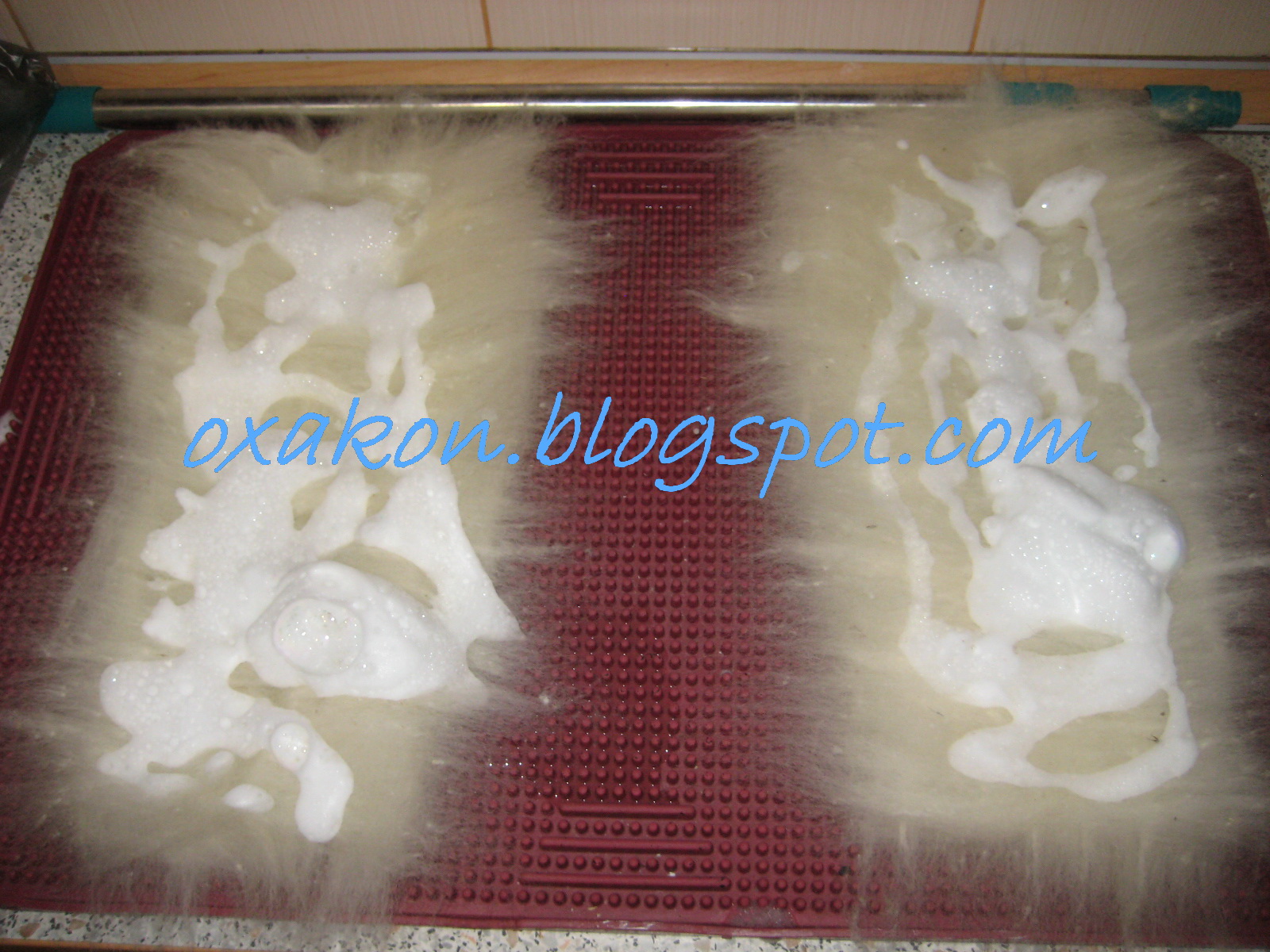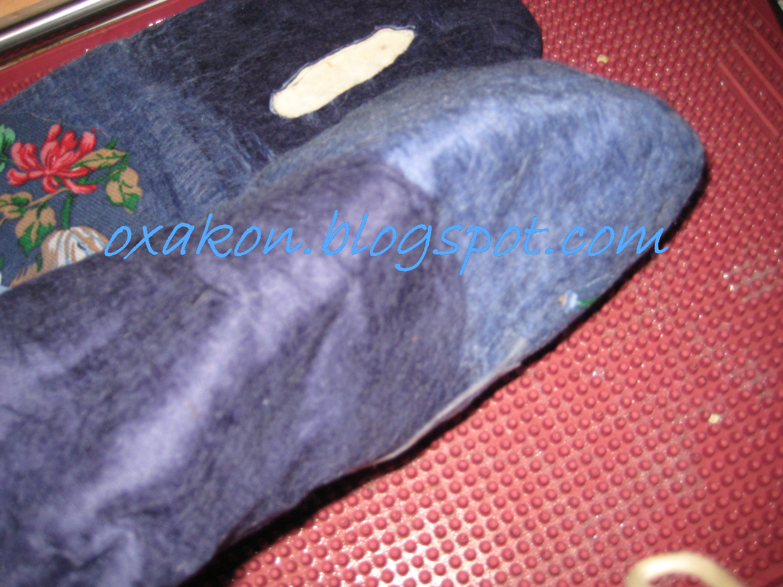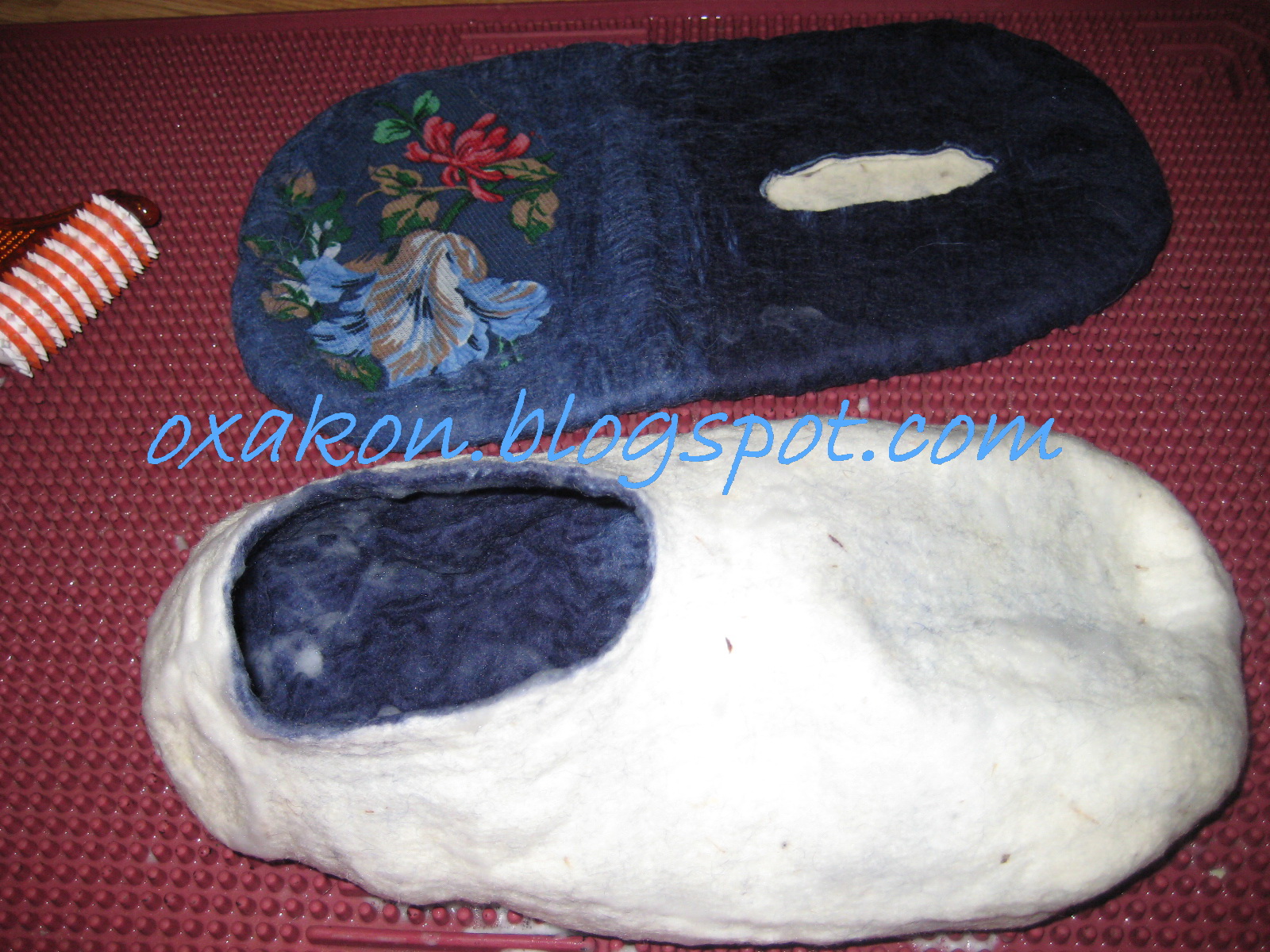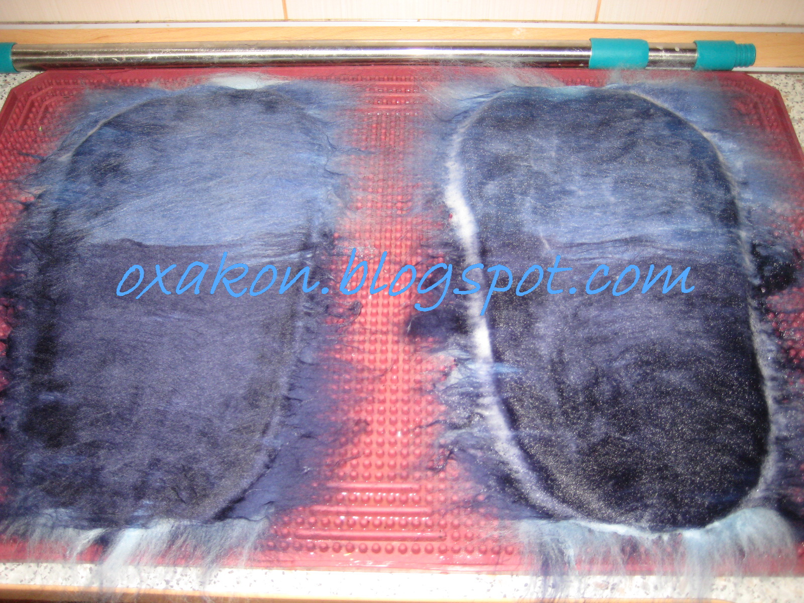 18. Далее занимаемся самим валянием - мнем тапочек, жамкаем (как тесто). Получается вот такая разница в тапках: