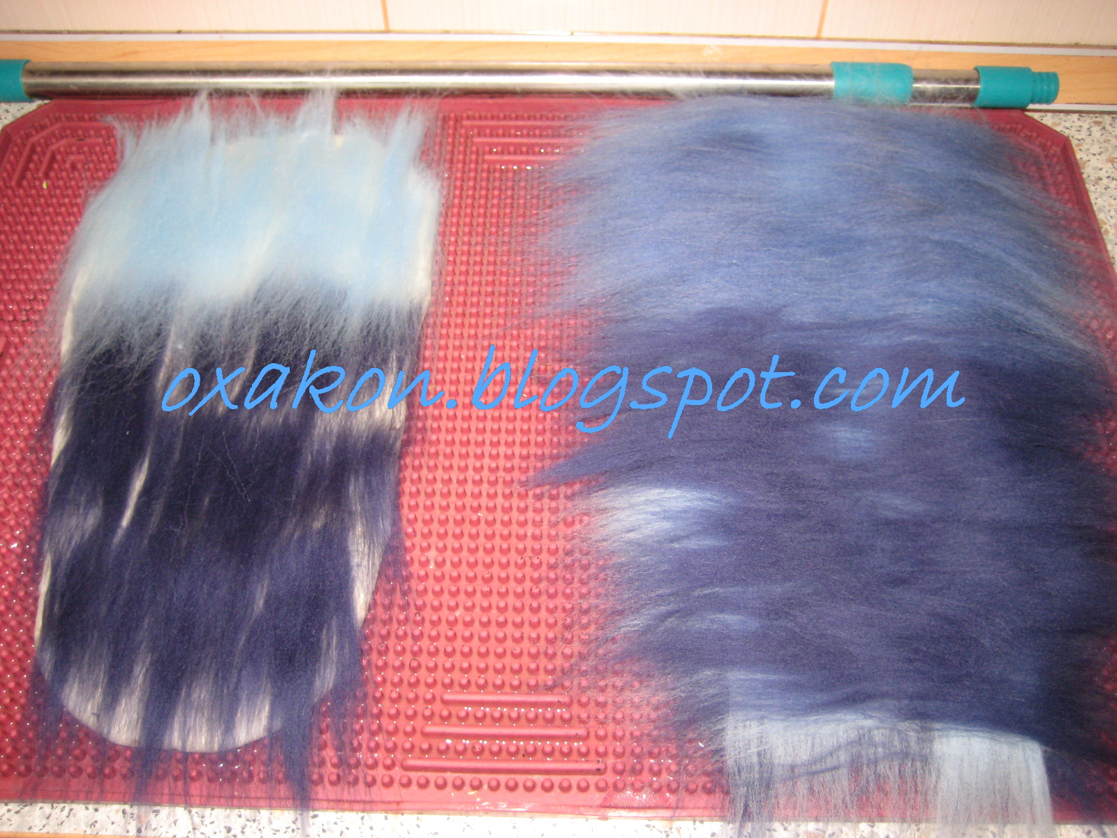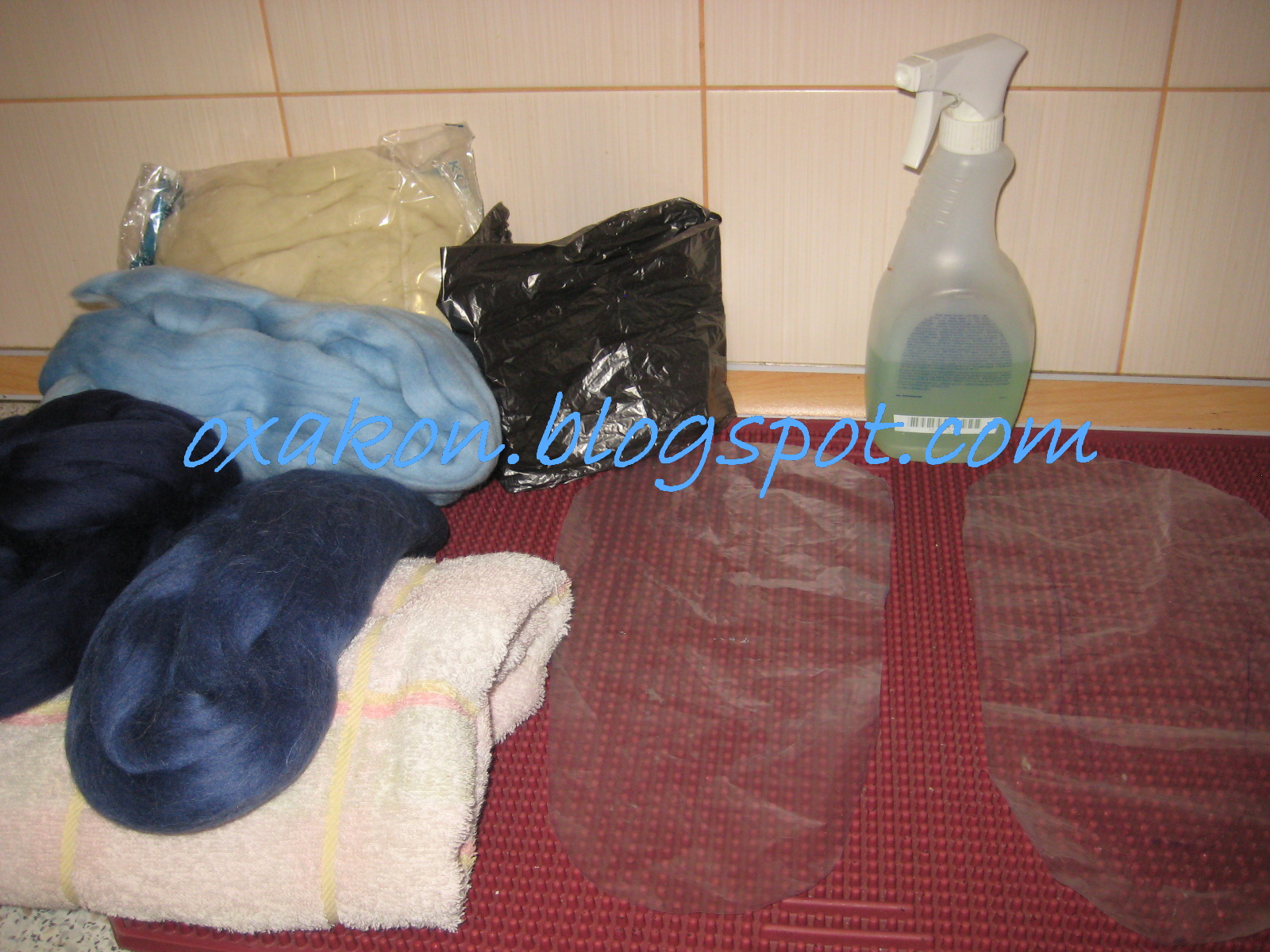 1. Итак, нам понадобятся: шерсть примерно 200 грамм (у меня остатки разных цветов синих оттенков, поэтому скомбинировала), мыльный раствор, пупырчатая пленка (в моем случае пупырчатый резиновый коврик за неимением пленки), украшалочки (у меня кусочки ткани-сеточки с цветочками), выкройка, перчатки по желанию.