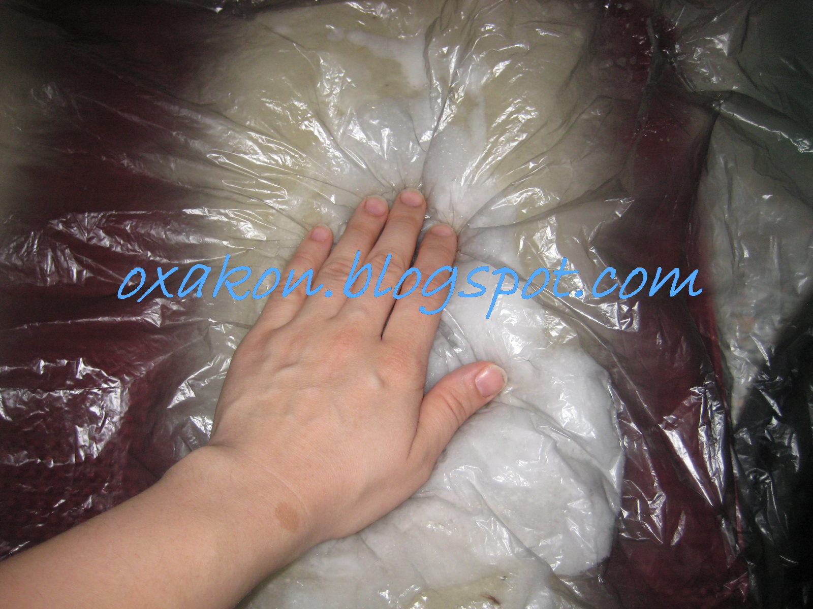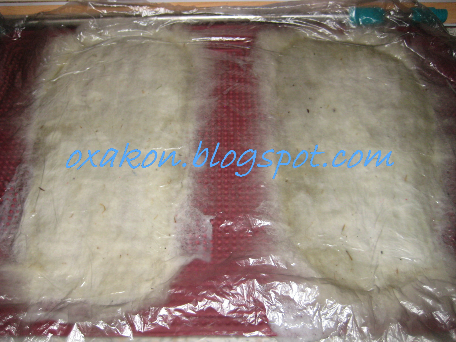 7. Мочим мыльной водой достаточно интенсивно, чтобы все слои шерсти хорошо пропитались. Сверху закрываем пленочкой (или сеточкой) и тихонько прижимаем руками от середины к краям, чтобы окончательно шерсть пропиталась мыльным раствором и вышли пузырьки воздуха. Слегка притираем, поглаживая, чтобы шерстка первоначально сцепилась между собой.