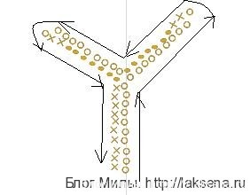 Третий ряд: *3 столбика с накидом в арку из 2 воздушных петель предыдущего ряда, 3 воздушных петли, 3 столбика с накидом* повторить 8 раз