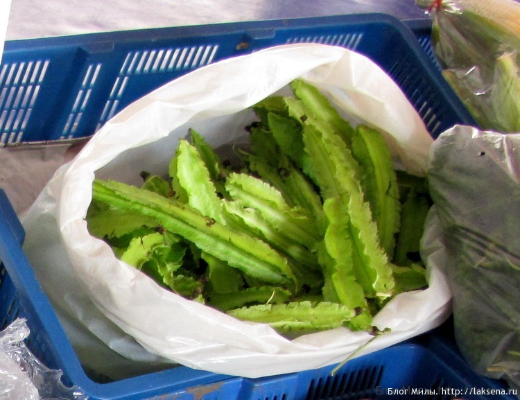 Гуляя по тайскому овощному рынку, часто можно встретить такие милые зеленые гофрированные “огурцы”. Это люфа (люффа, или луффа). Тайцы используют сладкие молодые плоды этого растения для приготовления многих традиционных блюд. Перед употреблением чистят от шкурки. Сушеные спелые плоды содержат толстые волокна и используются в качестве мочалки для ванны.
