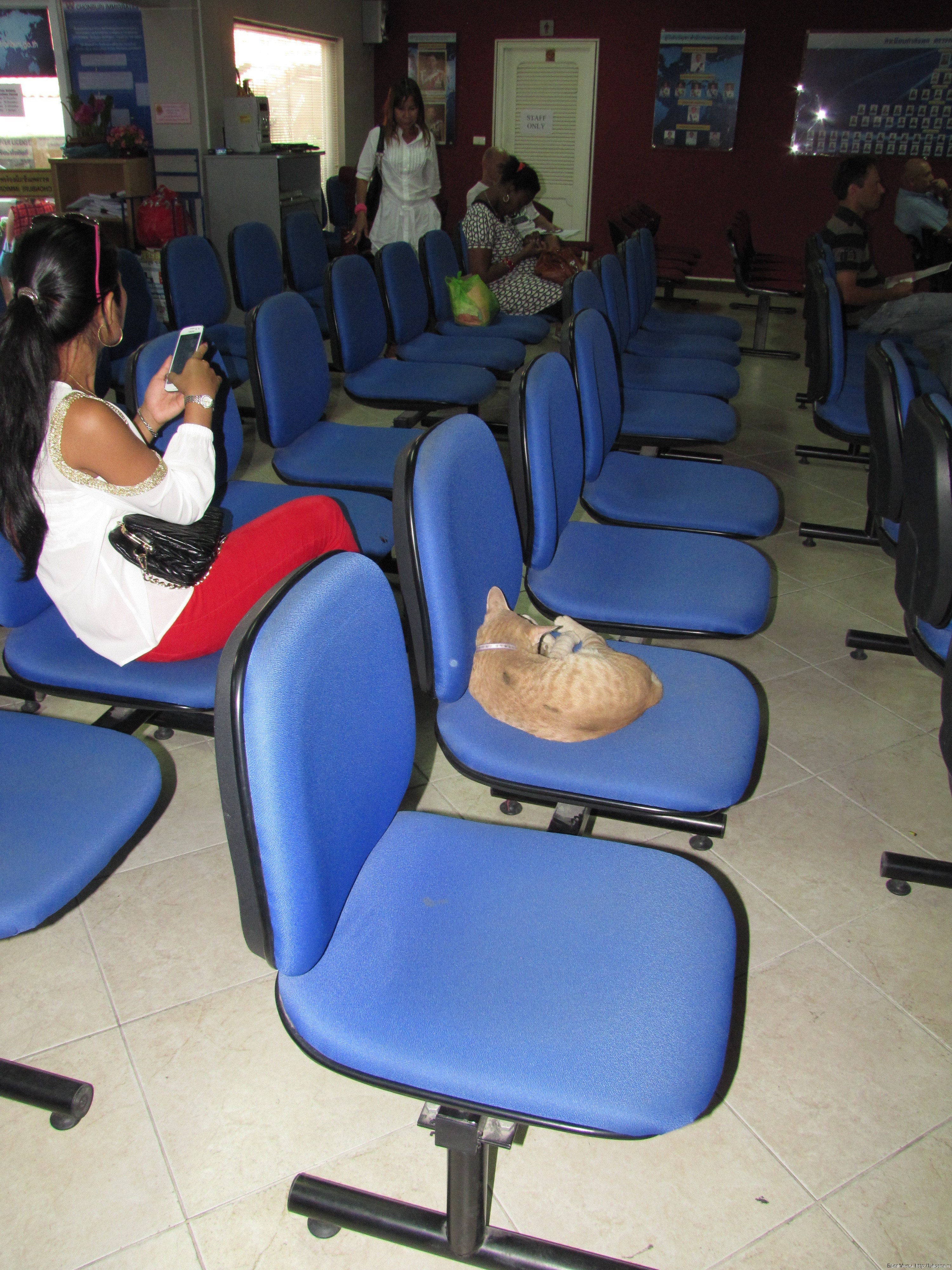 Там же, где брали бланки анкеты, выдают талон очереди. Возможно, нам просто не повезло, так как мы пришли в последний рабочий день года, и желающих решить визовые вопросы было очень много, но талон нам сразу не дали, а сказали подойти через час (так как очередь была такого размера, что до обеда её уже хватит). Через час мы получили свой талон, дождались окончания обеденного переыва (вмсете с нами своей очереди ждала и … кошка [показать] ) и получили возможность подать свои документы