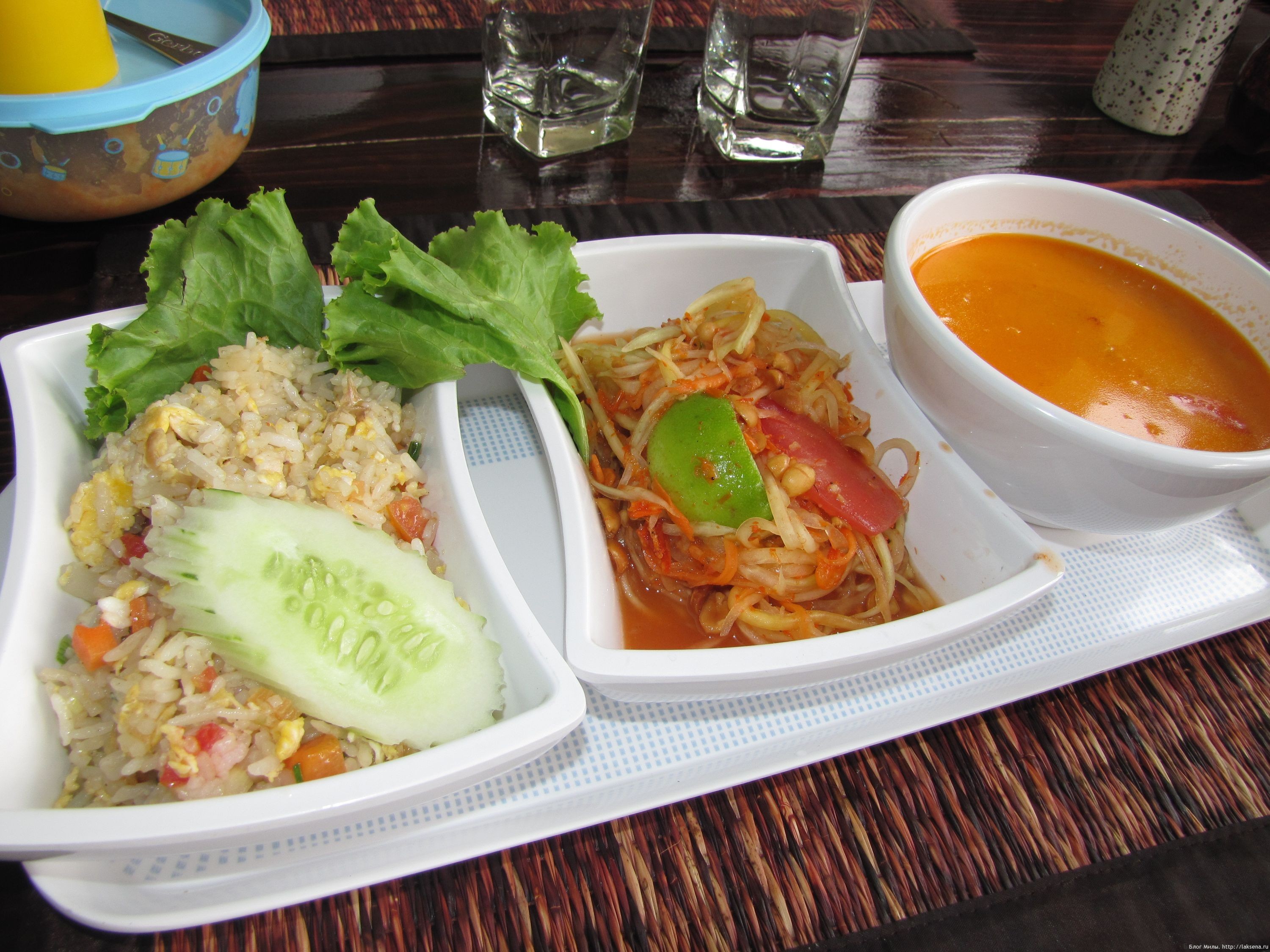 Дальше наступило время обеда с кулинарным шоу. На наших глазах повар приготовил три известных блюда тайской кухни: суп Том ям кунг, салат из зеленой папайи Сом там и жареный рис с курицей Кхао пад гай.