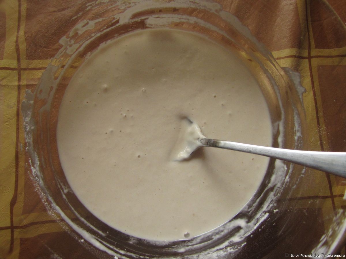 Дрожжи и сахар растворить в тёплой воде, добавить 1 стакан муки, тщательно перемешать.
