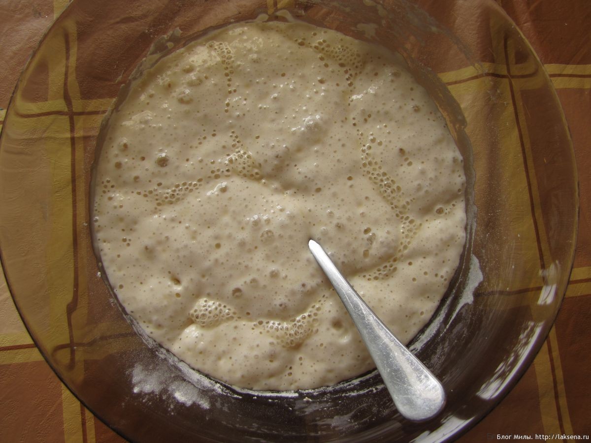 Поставить в теплое место, подождать, пока опара поднимется “шапочкой”.