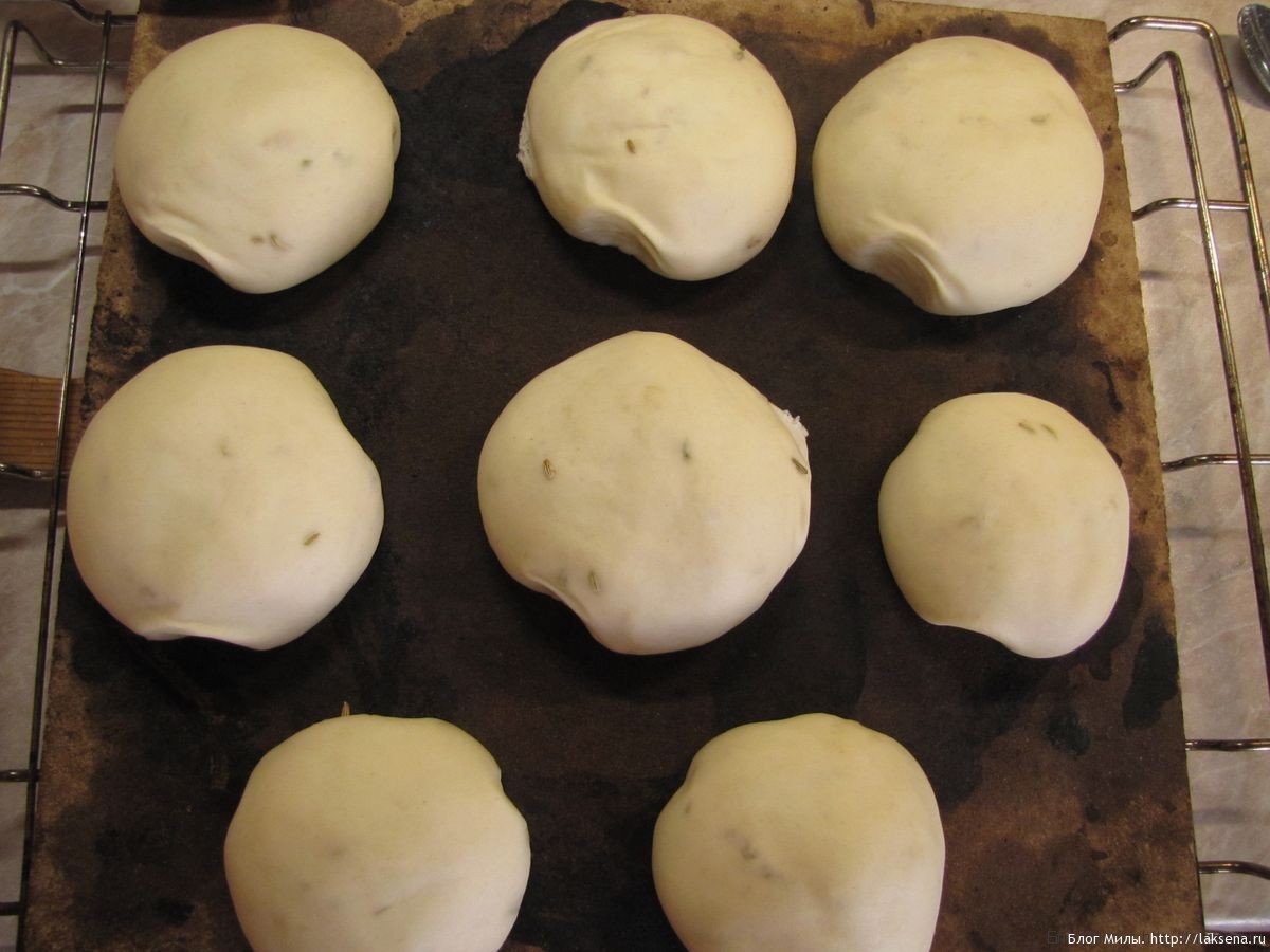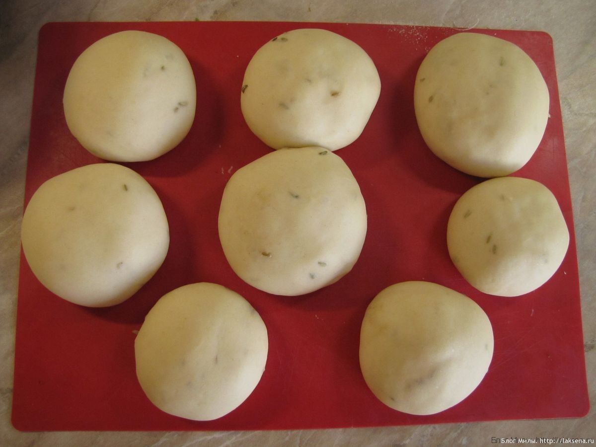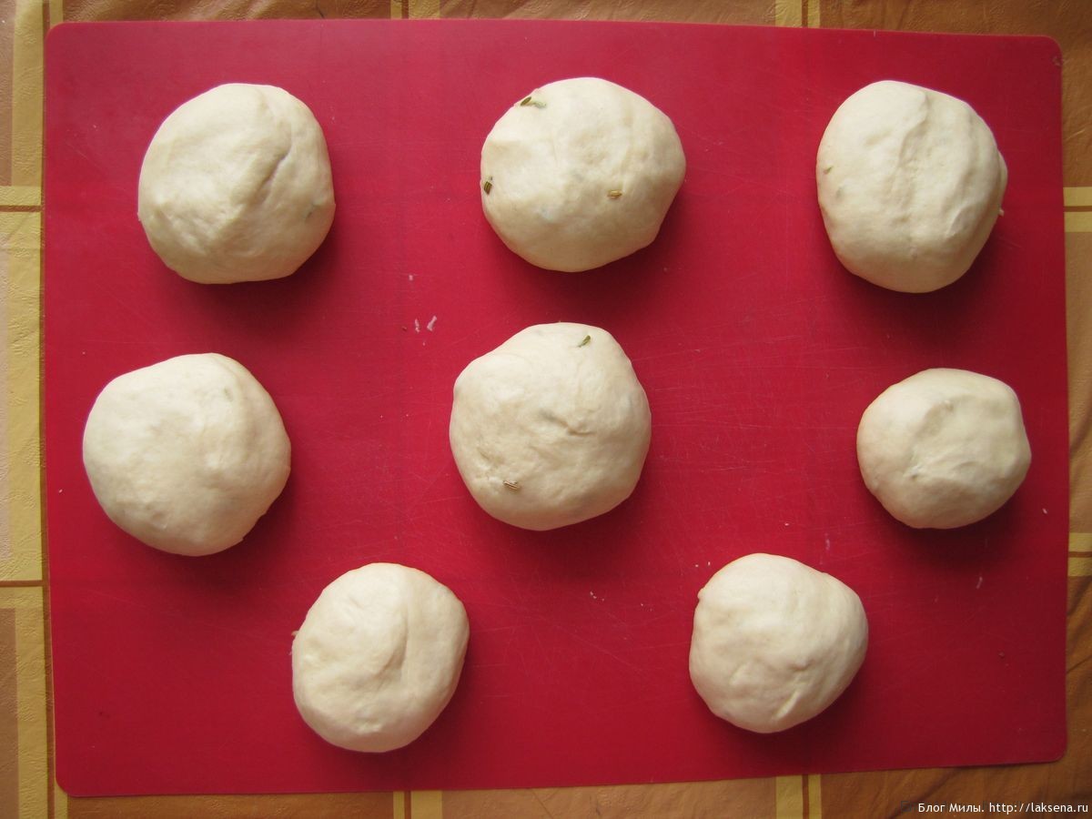 Тесто разделить на равные части (я делю на 8 частей) и сформировать булочки. Для ровной поверхности хлеба воспользуйтесь способом, показанным Аннушкой: http://www.youtube.com/watch?v=kB_qCfGBw2w\ Если выпекать на противне, то на этом этапе выложить булочки на противень