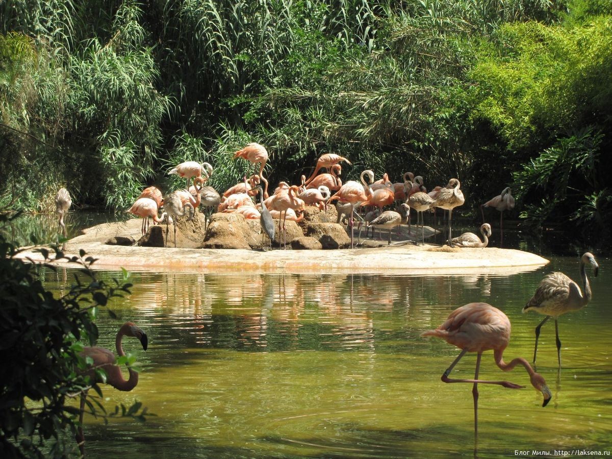 Фламинго, серые цапли и пеликаны живут в зоопарке под открытым небом, без всяких вольеров