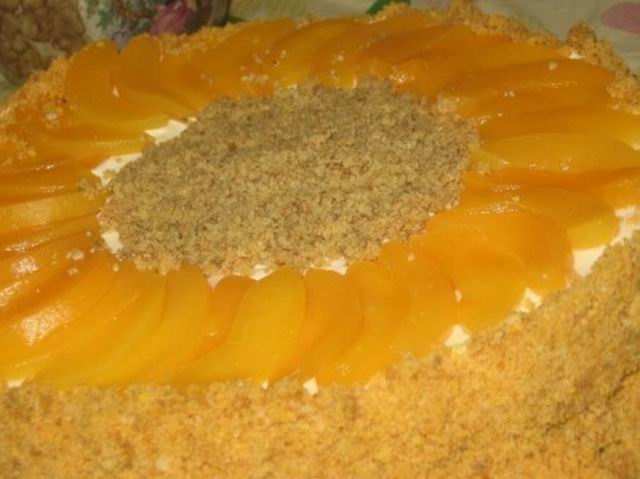 Ставим торт в холодильник примерно на час. Вынимаем тортик. Крем уже застыл. Выкладываем персики вторым слоем.