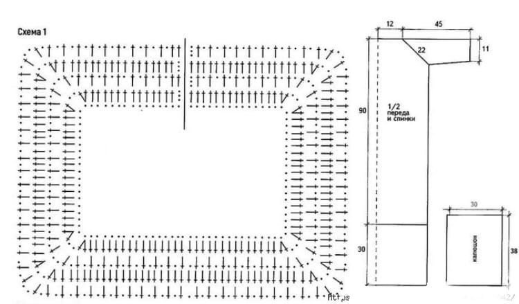 Набрать 124 возд. петли., разделить петли: по 40 петель на перед и спинку, по 20 петель . -на рукава. Вязать по схеме 1 поворотными рядами до желаемой длины без убавок. Всего от разделения на «тело» и рукава до разрезов должно быть 59 рядов. Далее разделить вязание на переднюю и заднюю части и продолжать вязать эти части по отдельности. Закрыть ряд, обрезать нить и присоединить к краю для начала вязания передней части. Вязать 23 ряда. Нить обрезать. Спинку вязать 37 рядов. Низ платья обвязать 1 рядом ст. б/н.