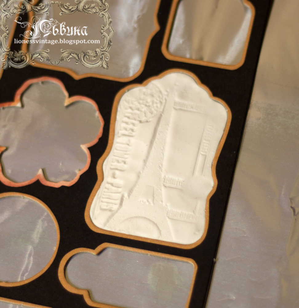 Достаем пластику, штампы, краски, пудру для эмбоссинга и остатки от чипборда - это послужит нам трафаретом.