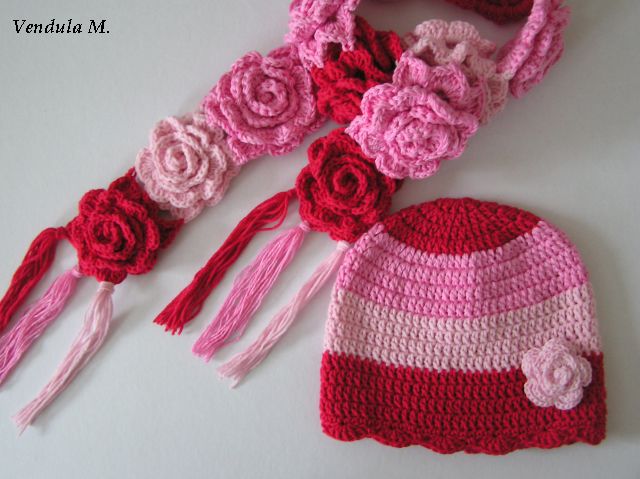 Белая шапочка и шарфик с розовыми цветами. Связано столбиками с накидом, обвязано рачьим шагом.