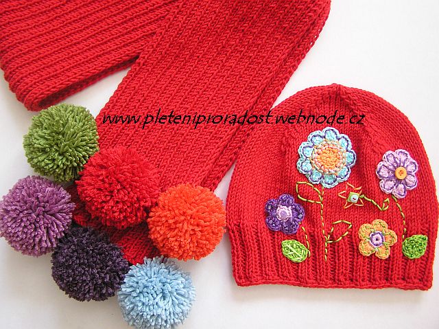 Красный комплект: шарф в резинку, простая шапочка лицевой гладью... Но на шапочке такие милые цветы, словно нарисованные ребенком, а шарфик украшен разноцветными помпонами - и в итоге нарядный веселый комплект, который понравится любой девочке.