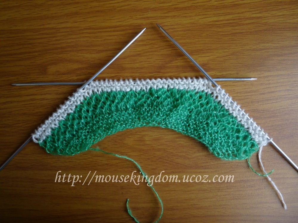 Зеленую нитку обрезаем, она нам больше не понадобится и вводим в работу белую нитку и вяжем белой нитью лицевыми петлями 4 ряда.