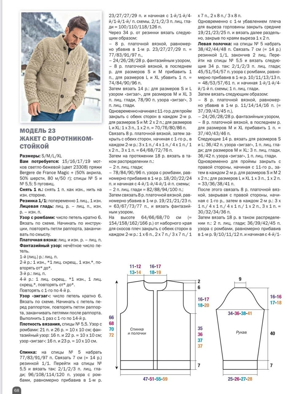 Шикарная мужская кофта с воротником-стойкой произвела впечатление. Довольно толстая пряжа (80 м/50 г) плюс чередование простых, но эффектных узоров обещают процесс быстрый и увлекательный.