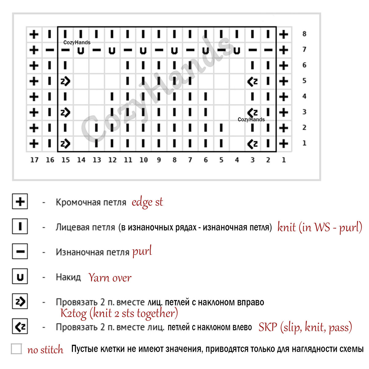 📗 Количество набранных петель должно быть кратно 14. При поворотном вязании прибавить 1 петлю для симметрии и 2 кромочные петли.