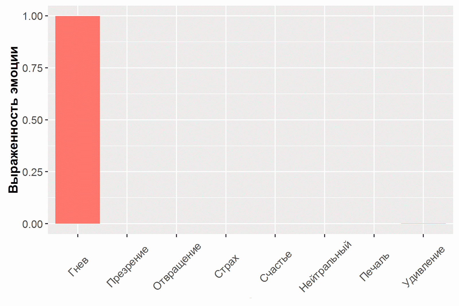 Вторая эмоция - отвращение. Алгоритм распознал её как смесь из гнева и нейтрального выражения. |