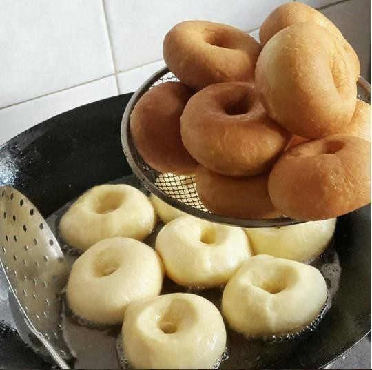 Приготовление: (я делала так) Молоко с водой смешать, немного нагреть Добавить весь сахар ...дрожжи Перемешать и дать дрожжам "ожить" (минут 15) Вот дрожжи "ожили", так достаточно Теперь добавляем яйцо Сливочное масло (можно комнатной температуры, можно растопленное) Соль Ванилин (в рецепте его нет, но с ним мне больше нравится). Все тщательно взбиваем венчиком. Теперь добавляем муку постепенно и мешаем ложкой Выкладываем тесто на стол и месим, месим, подсыпая муки. Тесто должно быть не сильно мягким, но и не забитым - средним. У меня ушло примерно 400 г муки, насколько я помню, но могу ошибаться... Тесто накрыть полотенчиком и оставить подходить на 1,5 часа, пока оно не увеличится вдвое. Если оно увеличится вдвое через час, значит достаточно и можно переходить к приготовлению пончиков Подошедшее тесто, раскатать пластом толщиной 1см., вырезать кружки среднего размера (я делала стаканом и они у меня получились большие, лучше чем то вроде рюмки...), и дать расстояться до тех пор, пока они увеличатся вдвое. Хорошо раскалить растительное масло (столько, что бы пончики плавали в масле, не касаясь дна) в глубокой сковороде. Обжарить их с двух сторон, до золотистого цвета. Готовые пончики выкладывайте на салфетки Пока жарится очередная порция пончиков, параллельно начиняйте готовые При обжарке, у пончиков остаётся белая полоска теста, которая проходит по всей окружности. Сделать на нём надрез острым ножом и положить начинку Можно и не начинять,а просто посыпать сахарной пудрой!