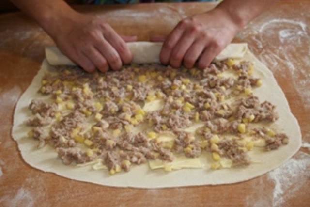 Тонко раскатываем тесто, выкладываем мясной фарш, на него -овощной.