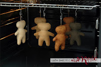 А вот так я их сушу в духовке. Я не кладу их на салфетку. Я делаю петельку из нитки и подвешиваю куклу на разогнутые скрепки, цепляя их за решетку.