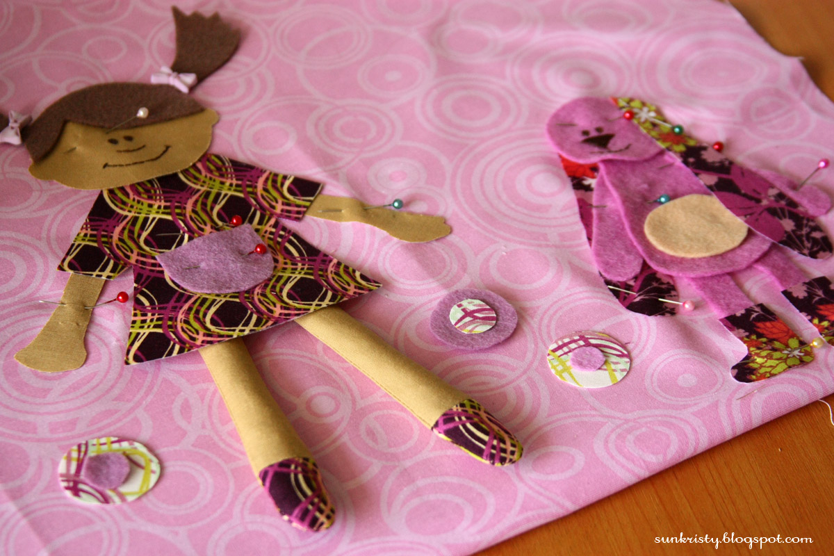 Сначала настрачиваем детали "нижнего слоя": руки, лапы, правое ухо зайца; потом "среднего" - платье (ножки девочки пристрачиваем вместе с платьем), туловище зайца; далее на очереди - головы, левое ухо, прическа, сапожки у зайца и его же трусарди. Иногда я нарушаю очередность (т.к. есть уже практика, не боюсь, что детали сдвинутся). Голову девочки, например, пристрочила сразу, при этом зафиксировав платье.