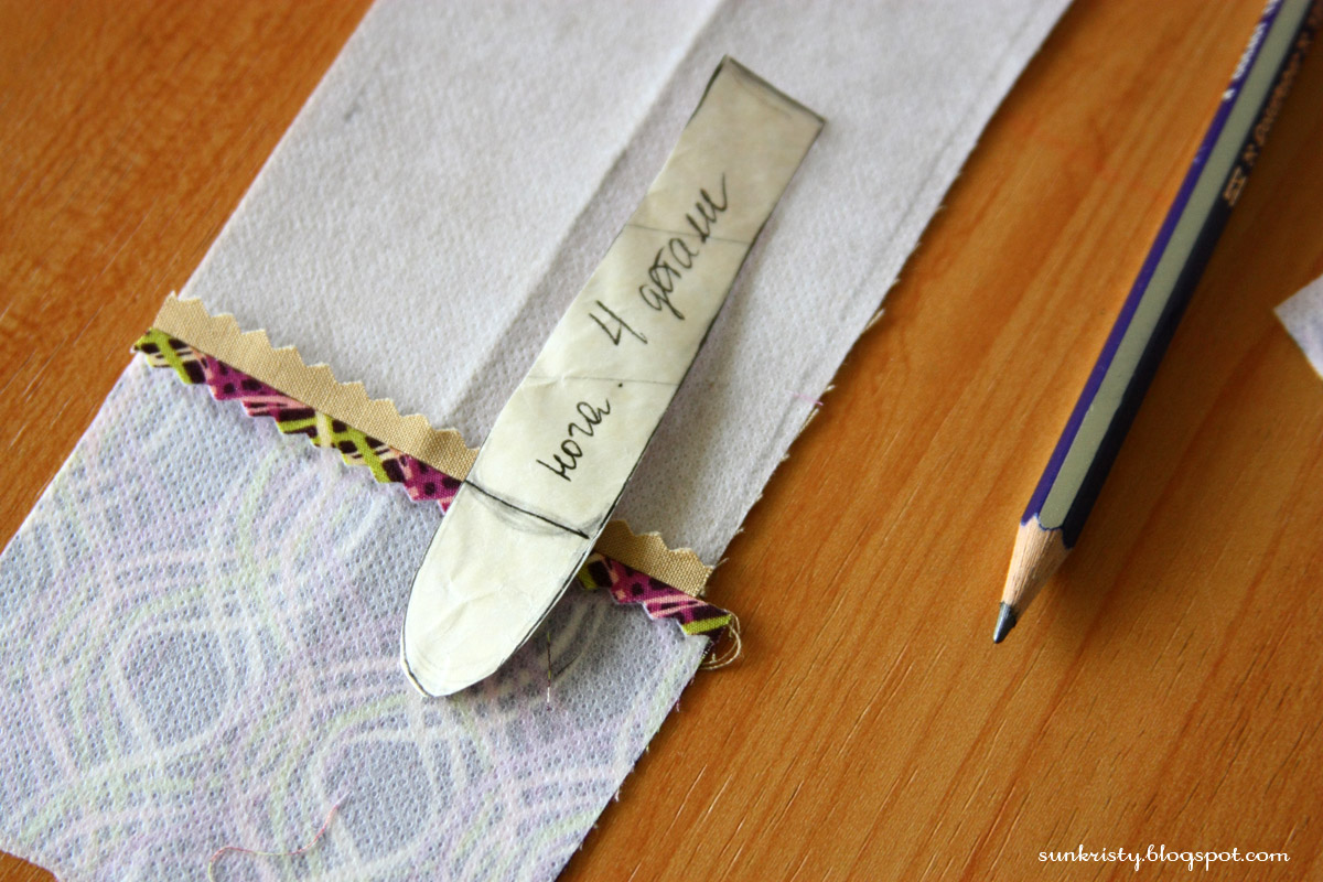 Для деталей ног девочки делаем небольшую заготовку. Здесь я использую принцип тильдовских игрушек (например, банщицы): когда детали тела сшиваются с одеждой/обувью.