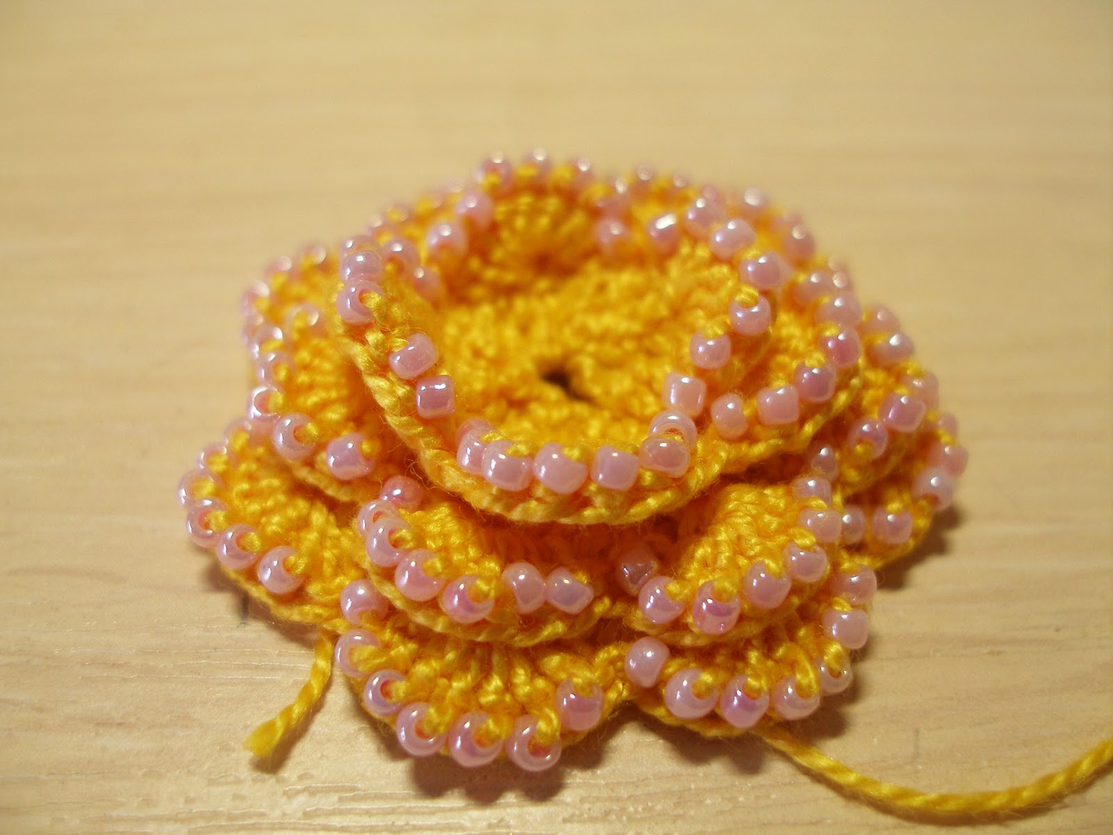 Видим, что в центре образовалось отверстие. Даже если у вас такого не получилось, все равно цветок хочется оживить. Подбираем бисер-бусинки и вышиваем серединку.