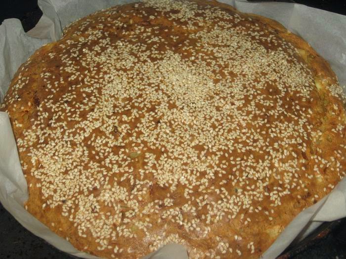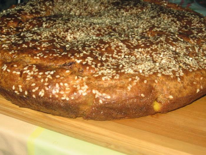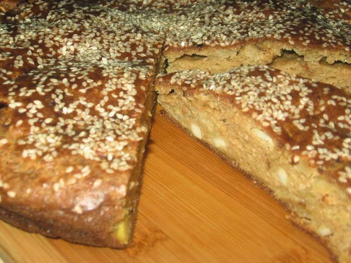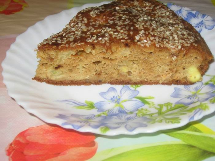 Вылить в приготовленную форму для выпечки, застеленную смазанным маслом пергаментом, или в кастрюлю мультиварки. В мультиварке пирог получится повыше, так как площать там поменьше, чем у моей формы. Сверху я посыпала кунжутом. Просто так.