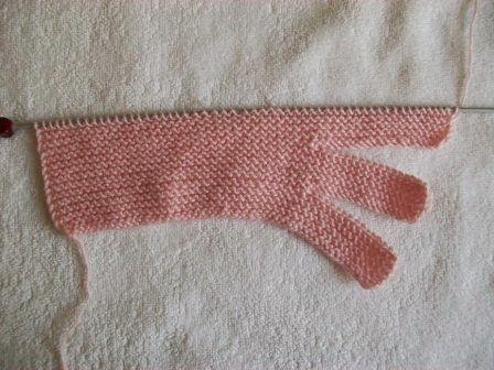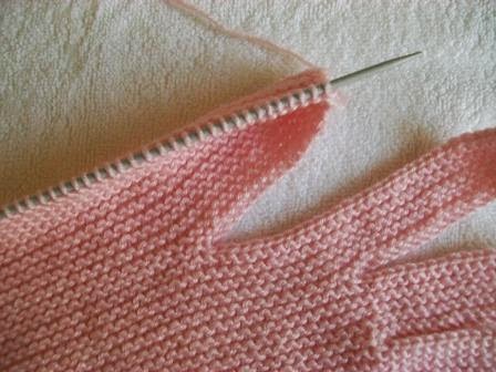 Набираем на спицы обычным набором столько петель, сколько в длину Ваша перчатка от начала манжета до кончика мизинца. И вяжем платочной вязкой полотно на ширину мизинца платочной вязкой.