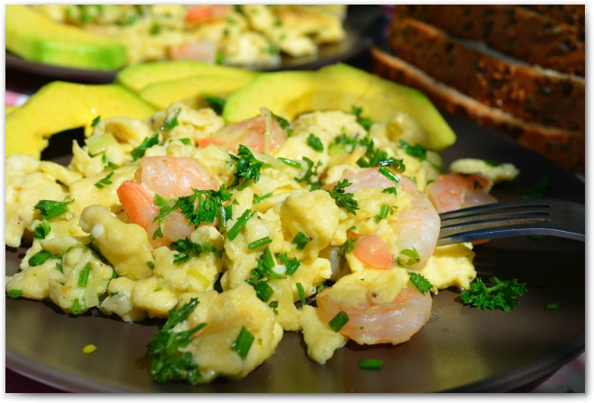7. Увеличиваем огонь до максимума и выливаем в сковороду яйца. Всё время активно перемешиваем их лопаткой, чтобы они не успевали схватиться и поджариться, так яйца остануться нежные и воздушные. Как только яйца готовы, сразу же снимаем с огня, добвляем зелень, перемешиваем и перекладываем на тарелки.