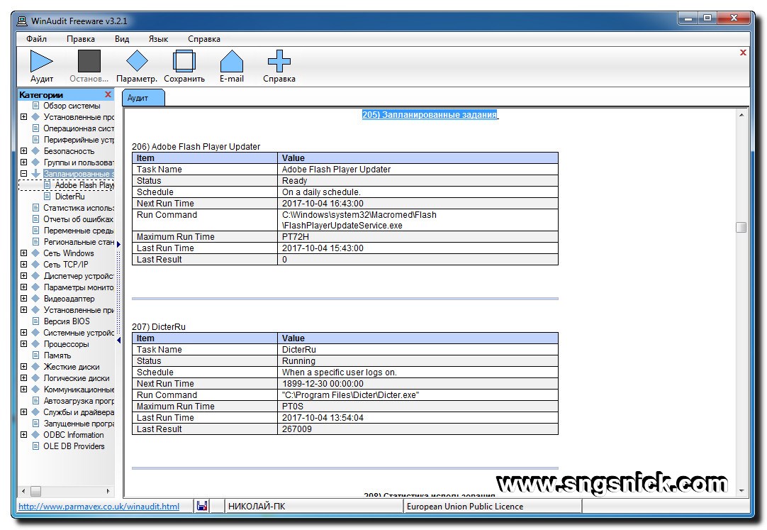 Познакомьтесь с простой, удобной и бесплатной программой WinAudit 3.2.1. WinAudit создает исчерпывающий отчет о конфигурации, аппаратном и программном обеспечении ПК на базе Windows. По своим возможностям программа не уступает платным аналогам. Вы можете посмотреть обширную информацию об операционной системе, периферийных устройствах, значениях BIOS, установленных программах, запланированных задачах, автозагрузке программ, запущенных программах и другую полезную информацию. В Параметрах Вы можете выбрать нужные категории для аудита. Отчет может быть сохранен в форматах HTML, CSV, CSV-2, RTF, отправлен по почте или экспортирован в базу данных. Программа изначально портативна и имеет небольшой размер. Русский язык поддерживается. Скачать проверенную на отсутствие вирусов портативную версию программы WinAudit 3.2.1 Rus Portable Вы можете быстро и бесплатно по ссылке, приведенной в конце статьи.