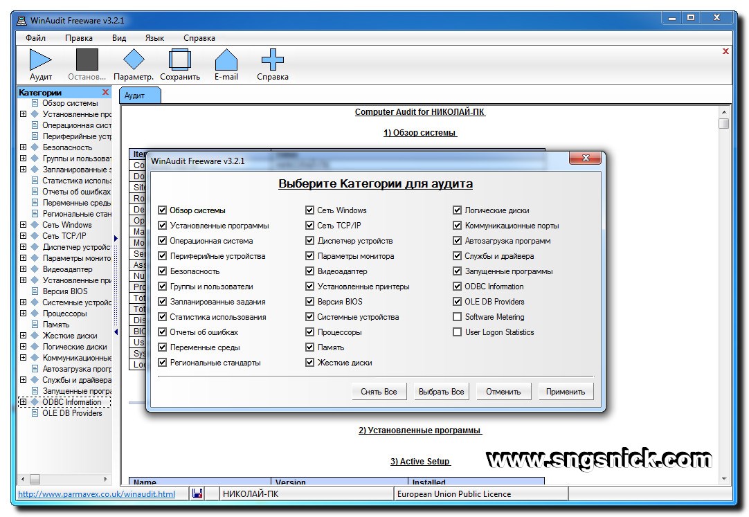 При запуске WinAudit вначале проводит сканирование (Аудит) категорий, установленных Вами в Параметрах.