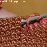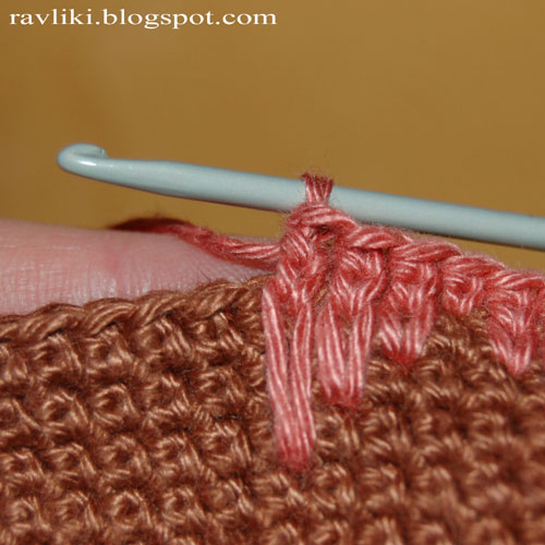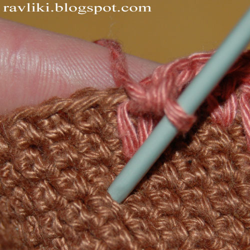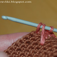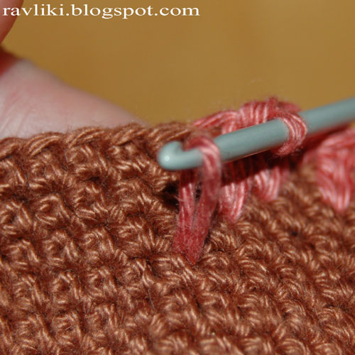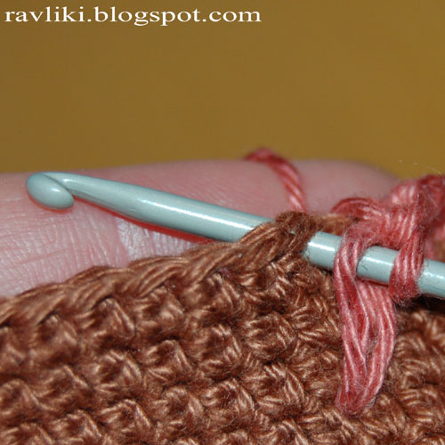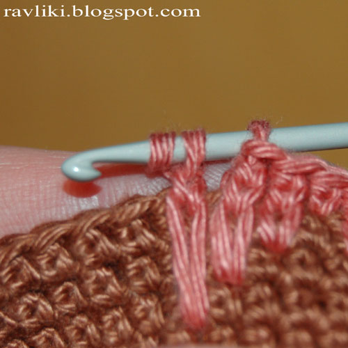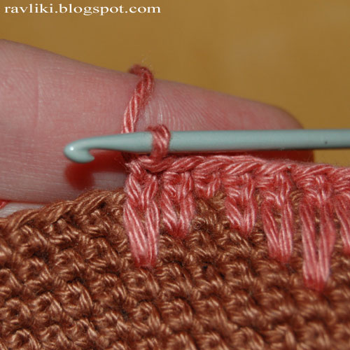 Вводим крючок под обе стенки верхнего столбика. (Если при этом петля "зубчика" перекручивается, то надо снять ее с крючка и подхватить с другой стороны, чтобы легла ровно.)
