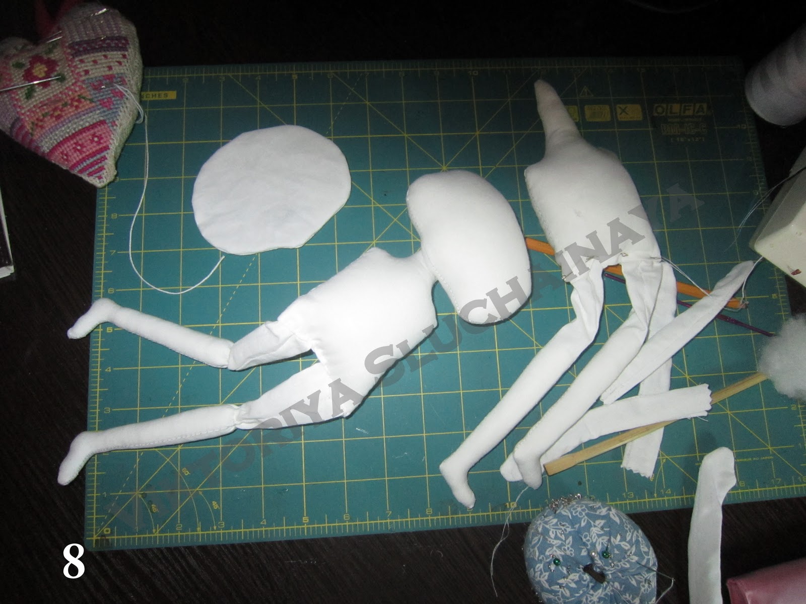 прошиваем пальчики на машинке или вручную.Затем набиваем руку плотно до локтя,затем свободно |