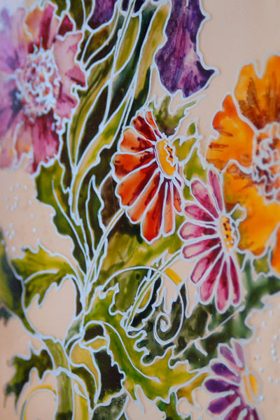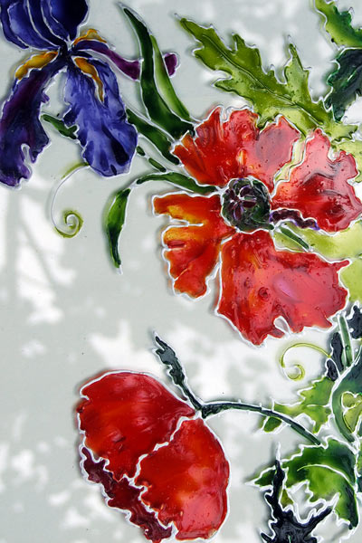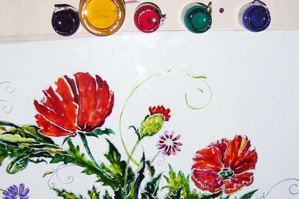 Использованы: контур по стеклу (серебристый) и витражные краски на водной основе (основные цвета – желтый, зеленый, красный, синий, черный). Они менее стойкие, чем те, которым необходим растворитель, но в работе – просты, а интенсивное использование, как, например, у посуды – здесь и не планировалось.:).