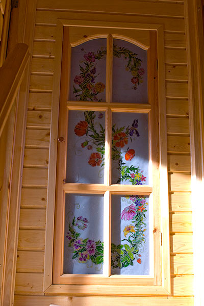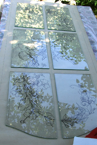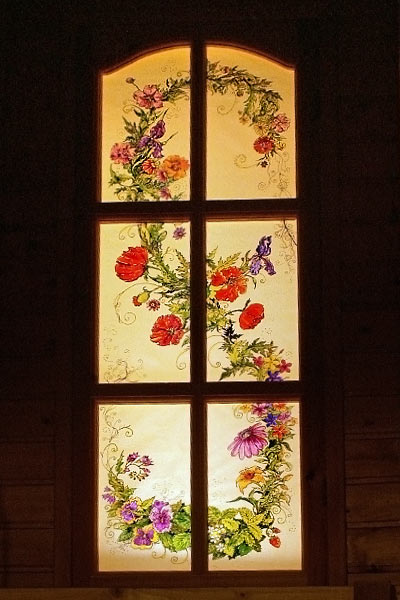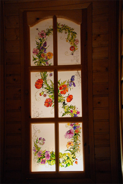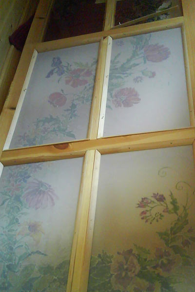Как варианты – можно ничего не подкладывать, или сразу расписывать матовое стекло, или приклеить витражную пленку и т.п.