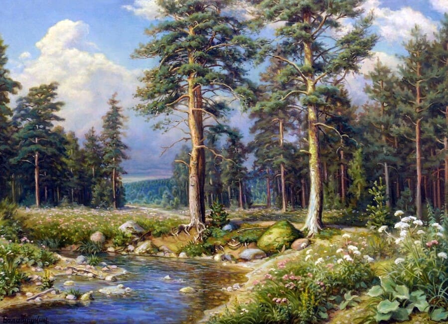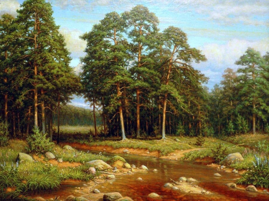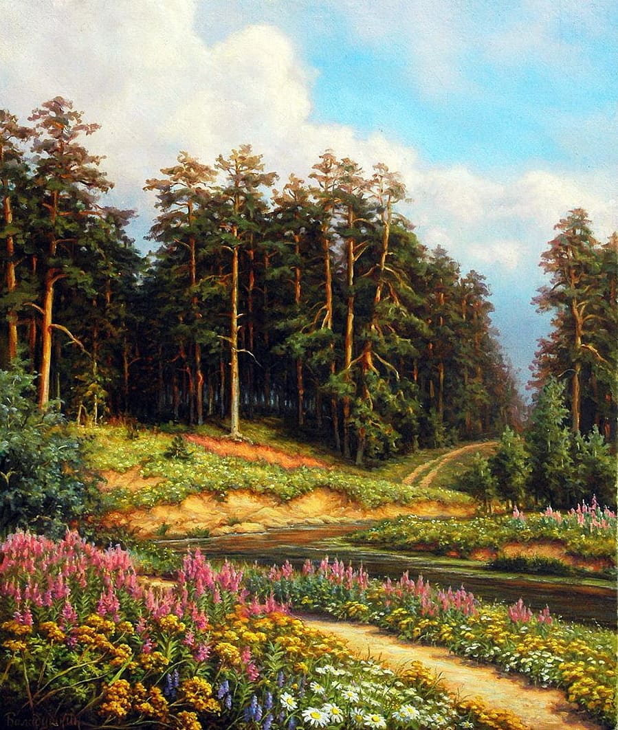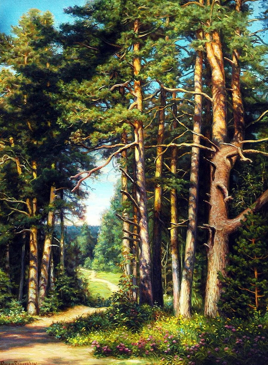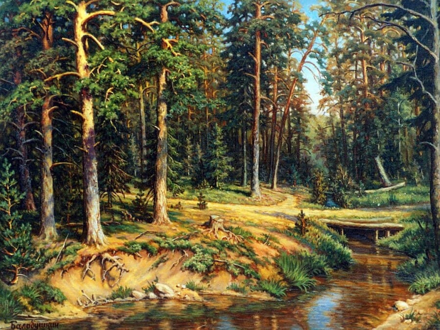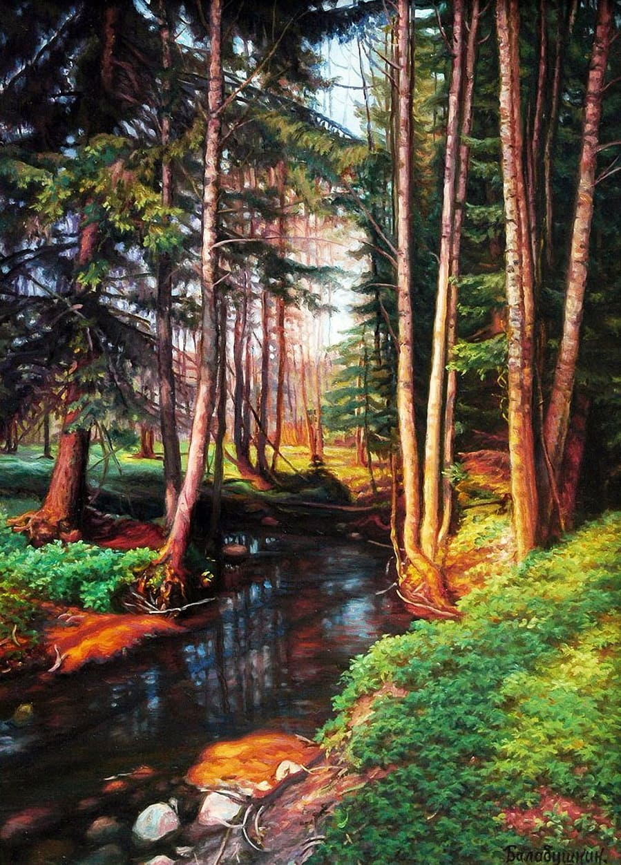 Шумят сосновые леса, И сосны стройные, литые, Как будто стрелы золотые. Уходят смело в небеса. Шумят сосновые леса, Как будто шепчут, что когда-то Скользили по морям фрегаты, Бриз надувал их паруса. Их нес с собою бег волны, А строили их из сосны! Шорыгина Т. Сергей Владимирович Балабушкин (Россия, 1969) ПейзажноЛетнеЛесное (часть-1) Церковь Преподобного Серафима Саровского в Песочном В лес вхожу, как в храм зелёный, А в душе - благоговенье; Там меня встречают строго Величавые деревья. По ковру из трав зелёных, По подушкам мха, иголок, Мягко - бережно ступаю: Тут ложбинка, там - пригорок Вот берёзки и осинки, Торопливой стайкой сжались; А под ними, как картинки, Напоказ, грибы сбежались. Подосиновиков - войско, В шляпах светло - рыжеватых. Сыроежки и маслята - Демонстрировали шляпы! Очищаю шляпы нежно От травинок и иголок. Чувство радости - безбрежно, Средь осин, берёзок, ёлок! По ложбинкам, по пригоркам, Мягкой тропкою - дорожкой, Я ступаю осторожно... Радость дня несу в лукошке! (Маргарита Володина 2) В лесу все кажется другим: вкус еды, воздух, мысли. Человек становится чище. Порой нам всем нужно бежать в леса, дабы не потерять себя. Здесь мы обретаем душевный комфорт, постигаем свою истинную сущность. Художник Сергей Владимирович Балабушкин родился в 1969 г. в г. Ленинграде. Закончил Ленинградский инженерно-строительный институт, архитектурный факультет. Живопись, так или иначе, проходит через всю мою жизнь. Рисовал я всегда. С детства и в юности - это графические работы и акварели. Сергей Балабушкин – большой мастер, настоящий художник со своей особенной манерой. В свое время Сергей Владимирович закончил Ленинградский Инженерно-Строительный институт (архитектурный факультет), работал в художественной мастерской Военно-Медицинской Академии. Провел персональные выставки в Союзе художников и ЦКТИ имени Ползунова. В настоящее время - свободный художник. Пишет картины маслом. Да, влияние И.Шишкина на его манеру письма чувствуется, но вместе с тем его собственные работы ярче, праздничнее и созданы в своей собственной манере, наполнены любовью к изображаемому пространству и каким-то особым теплом и настроением. Это поистине праздник души.