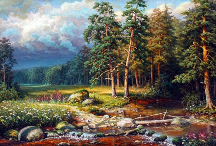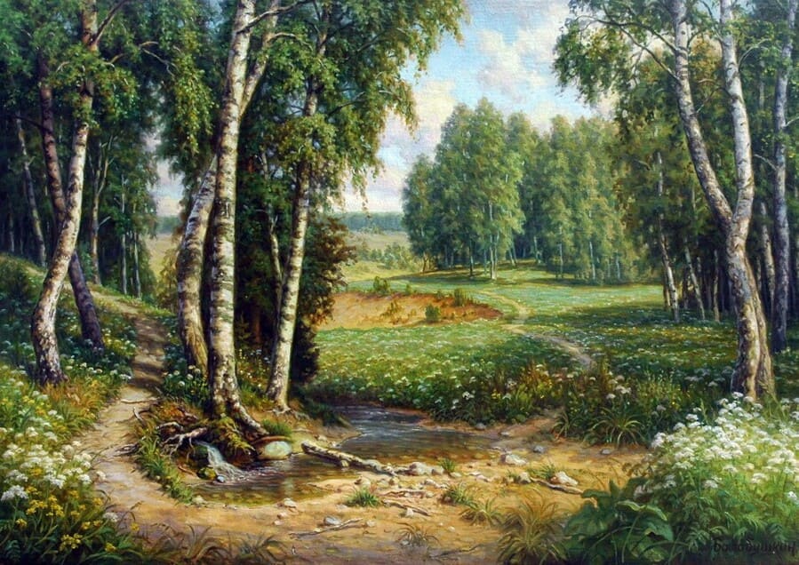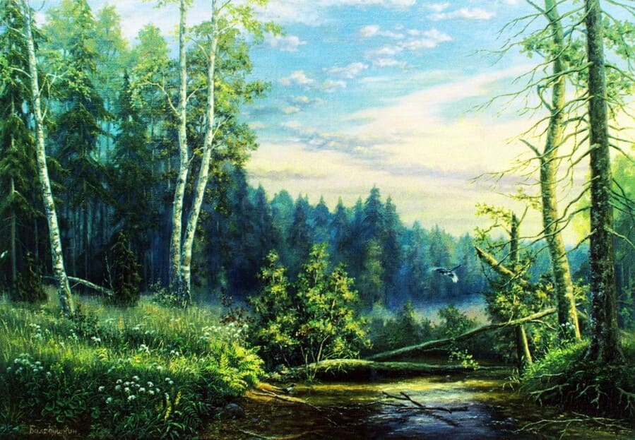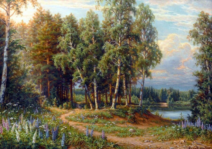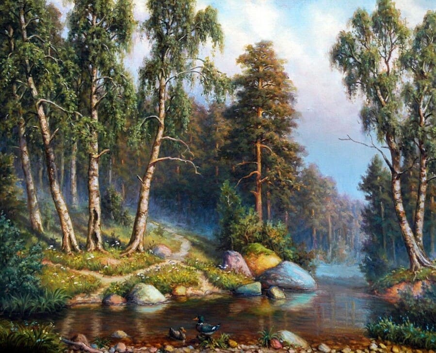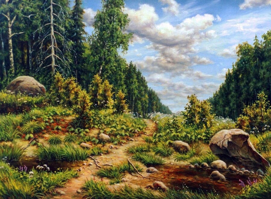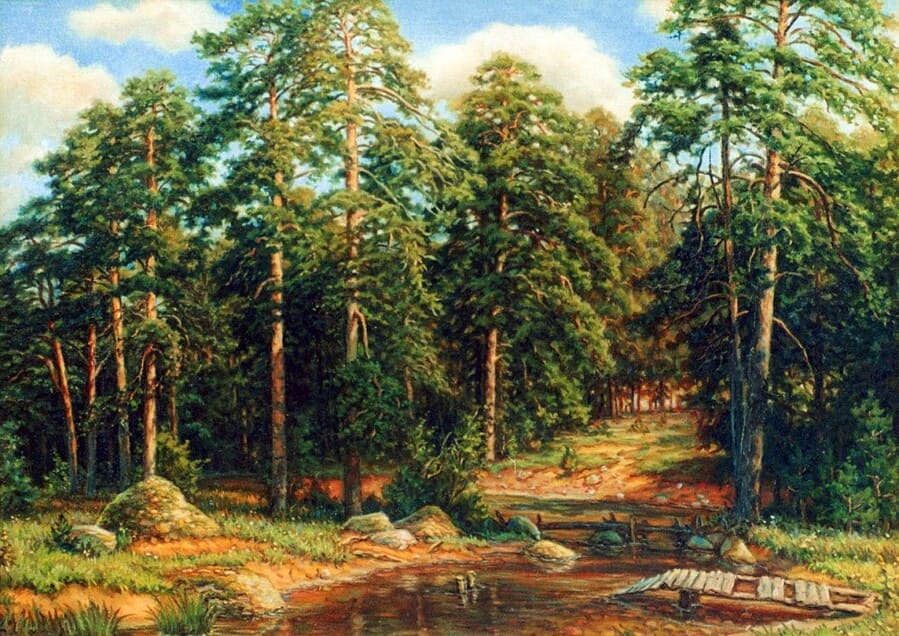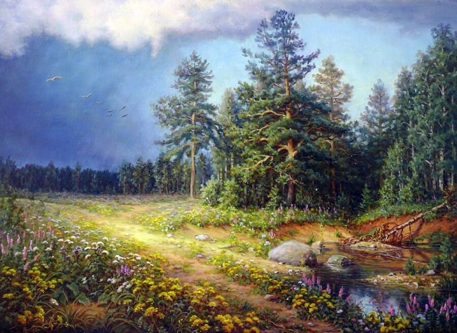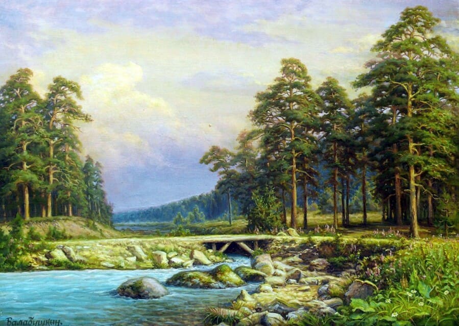 Шумят сосновые леса, И сосны стройные, литые, Как будто стрелы золотые. Уходят смело в небеса. Шумят сосновые леса, Как будто шепчут, что когда-то Скользили по морям фрегаты, Бриз надувал их паруса. Их нес с собою бег волны, А строили их из сосны! Шорыгина Т. Сергей Владимирович Балабушкин (Россия, 1969) ПейзажноЛетнеЛесное (часть-1) Церковь Преподобного Серафима Саровского в Песочном В лес вхожу, как в храм зелёный, А в душе - благоговенье; Там меня встречают строго Величавые деревья. По ковру из трав зелёных, По подушкам мха, иголок, Мягко - бережно ступаю: Тут ложбинка, там - пригорок Вот берёзки и осинки, Торопливой стайкой сжались; А под ними, как картинки, Напоказ, грибы сбежались. Подосиновиков - войско, В шляпах светло - рыжеватых. Сыроежки и маслята - Демонстрировали шляпы! Очищаю шляпы нежно От травинок и иголок. Чувство радости - безбрежно, Средь осин, берёзок, ёлок! По ложбинкам, по пригоркам, Мягкой тропкою - дорожкой, Я ступаю осторожно... Радость дня несу в лукошке! (Маргарита Володина 2) В лесу все кажется другим: вкус еды, воздух, мысли. Человек становится чище. Порой нам всем нужно бежать в леса, дабы не потерять себя. Здесь мы обретаем душевный комфорт, постигаем свою истинную сущность. Художник Сергей Владимирович Балабушкин родился в 1969 г. в г. Ленинграде. Закончил Ленинградский инженерно-строительный институт, архитектурный факультет. Живопись, так или иначе, проходит через всю мою жизнь. Рисовал я всегда. С детства и в юности - это графические работы и акварели. Сергей Балабушкин – большой мастер, настоящий художник со своей особенной манерой. В свое время Сергей Владимирович закончил Ленинградский Инженерно-Строительный институт (архитектурный факультет), работал в художественной мастерской Военно-Медицинской Академии. Провел персональные выставки в Союзе художников и ЦКТИ имени Ползунова. В настоящее время - свободный художник. Пишет картины маслом. Да, влияние И.Шишкина на его манеру письма чувствуется, но вместе с тем его собственные работы ярче, праздничнее и созданы в своей собственной манере, наполнены любовью к изображаемому пространству и каким-то особым теплом и настроением. Это поистине праздник души.