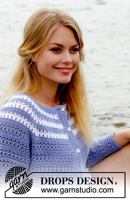 Вам потребуется: пряжа DROPS SAFRAN от Garnstudio 350-400-450-500-500-550 г цвет 05, сиренево-голубой; 50-50-50-50-50-50 г цвет 17, белый; крючок № 3.5 мм; 7-7-7-8-8-8 пуговиц.