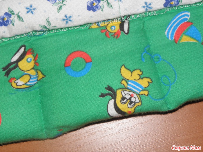 Затем взяла зеленое полотно такого же размера, наложила его на получившийся «бутерброд», и обметала края оверлоком (для удобства, чтобы все 3 слоя и синтепон держались вместе. Правда после изготовления этого матрасика мой оверлок сломался, все таки толстые детали, на фотках видно, что оверлок обметывает неаккуратно, зато держит!). Всё, основа нашего матрасика готова, теперь займемся бортиками, они должны защищать малыша от удара о бортики комода, значит тоже должны быть мягкими, т. е с синтепоном. Измеряем 3 стороны (у которых будут бортики) нашей основы, получилось примерно 2.05 (сделаем прибавку на складки в уголках примерно 15 см). Сшиваем полосу 2.20*0.20 из частей зеленого цвета и точно такую же полосу белого цвета. Для удобства и при наличии материала одного цвета изготавливаем полосу 2.20*0.40. Складываем ее пополам вдоль и прокладываем синтепон по всей длине. Тоже прострачиваем на расстоянии, примерно 8см.