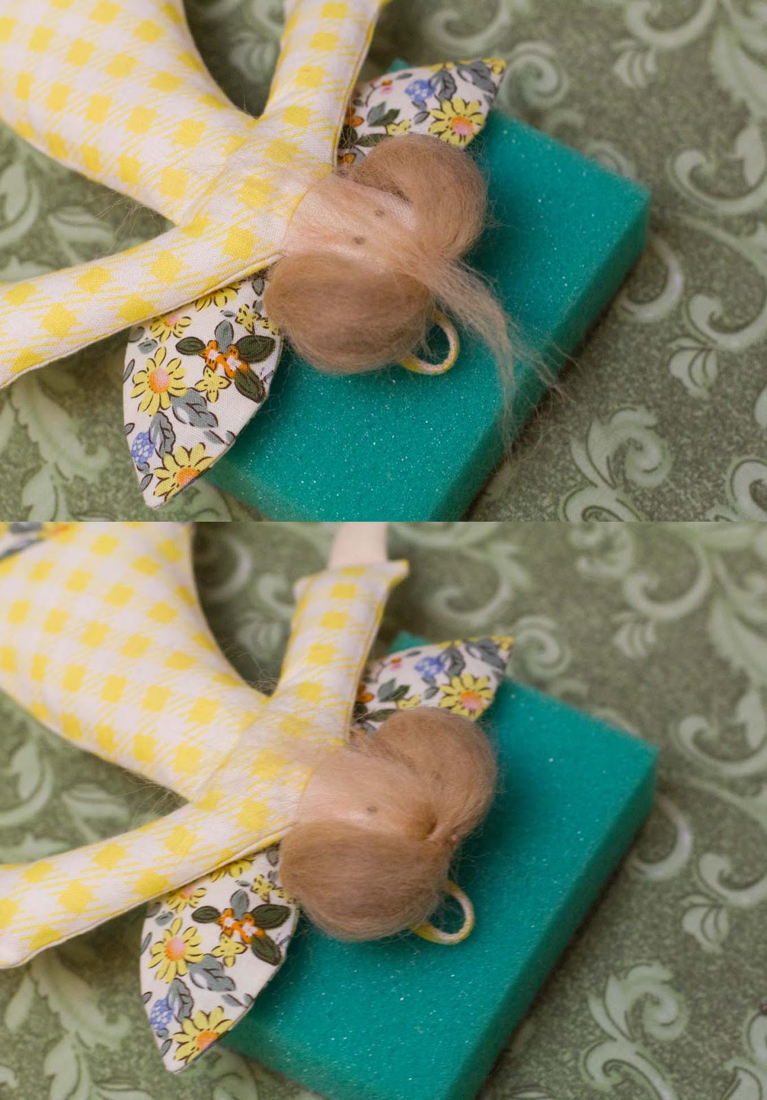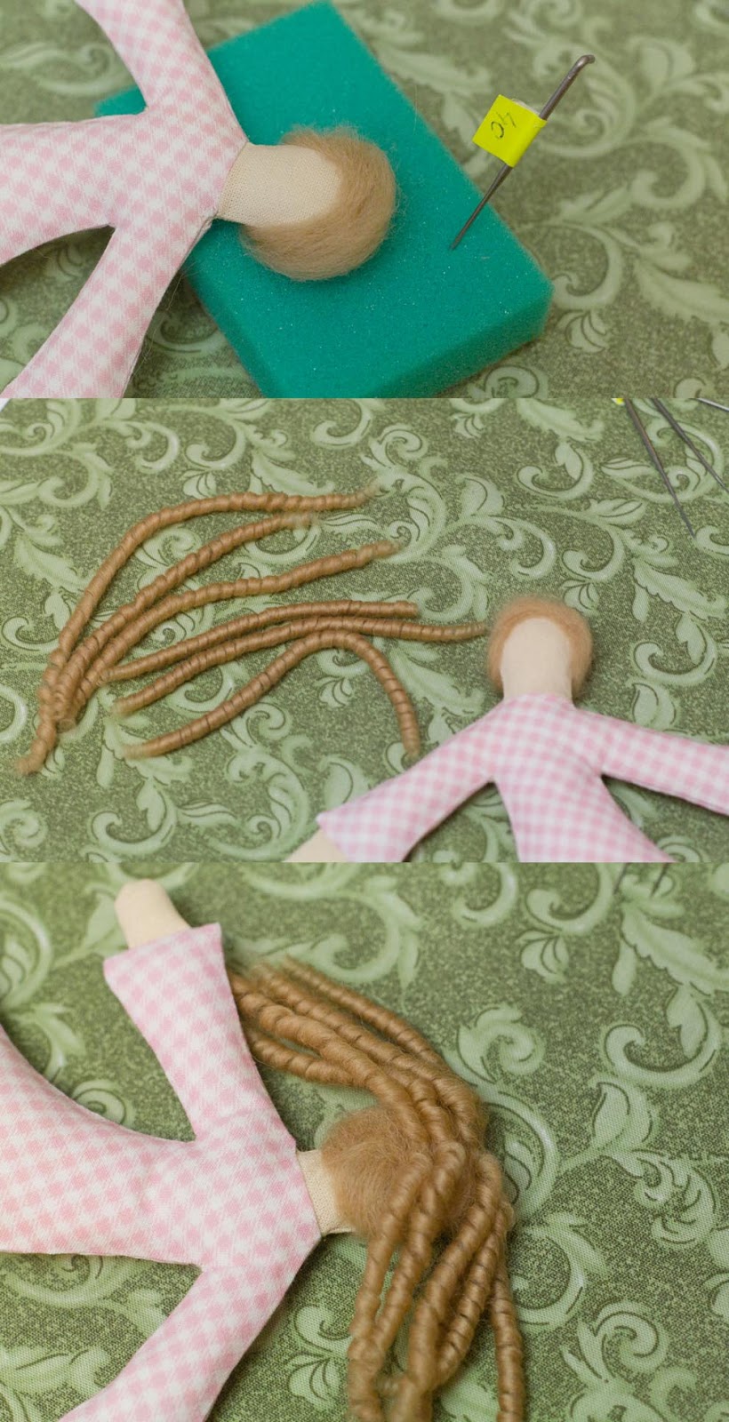 Настал черёд украшать нашего ангела! Делаем волосы. Мне нравятся волосы натуральных цветов, я использовала шерсть для валяния: