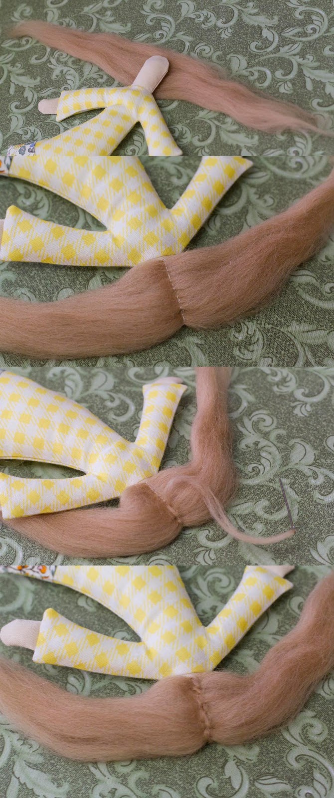 5. Тонкие длинные кончики вставляем в иголку с большим ушком и пришиваем этой "нитью" волосы двумя-тремя большими стежками (проверяем, чтобы на лице не вылезло ничего лишнего):