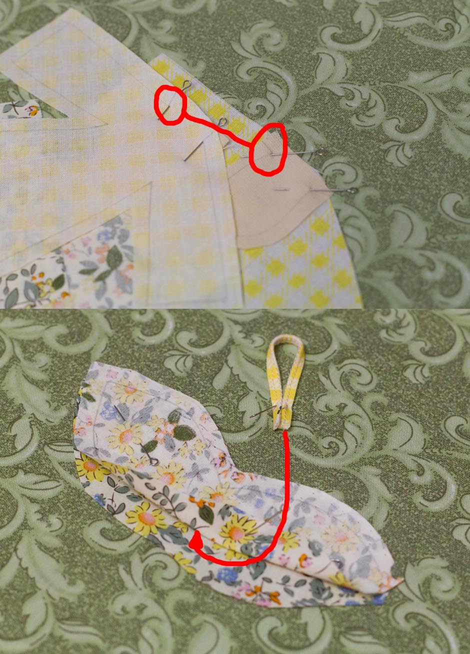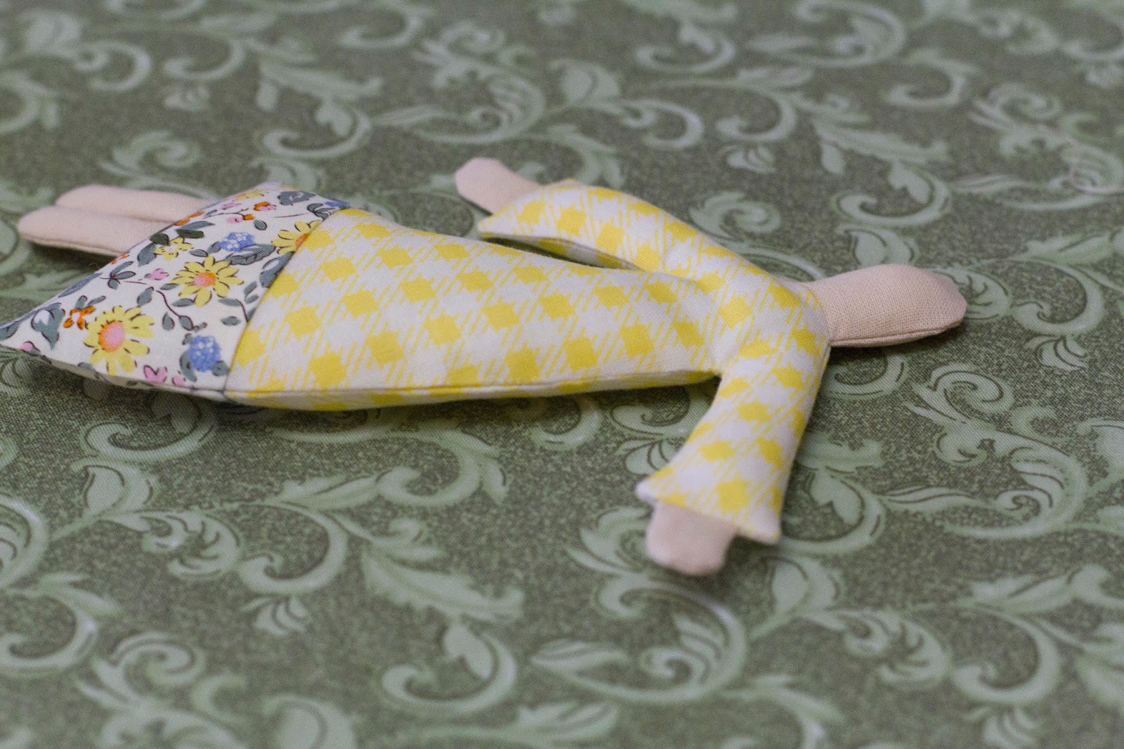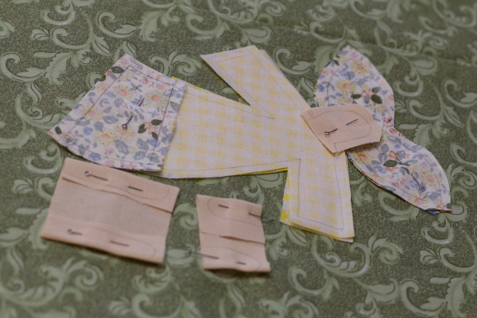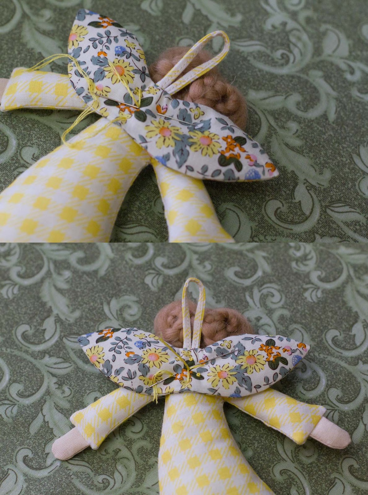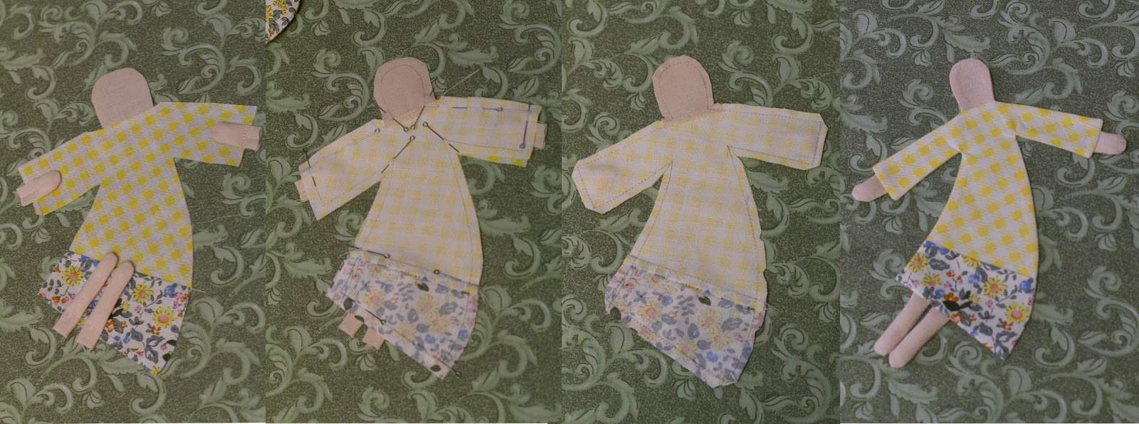 Можете "разрезать" платье как душе угодно =) Перерисовываем (простым карандашом) выкройку на ткани, скрепляем булавками и сшиваем по контуру ручки-ножки. Голову к телу я прикалываю через "контрольные точки" - смотри фото. А в крылья внутрь вставляю предварительно ленточку (при прострачивании не забудьте оставить отверстие для выворачивания - внизу крыльев посередине)