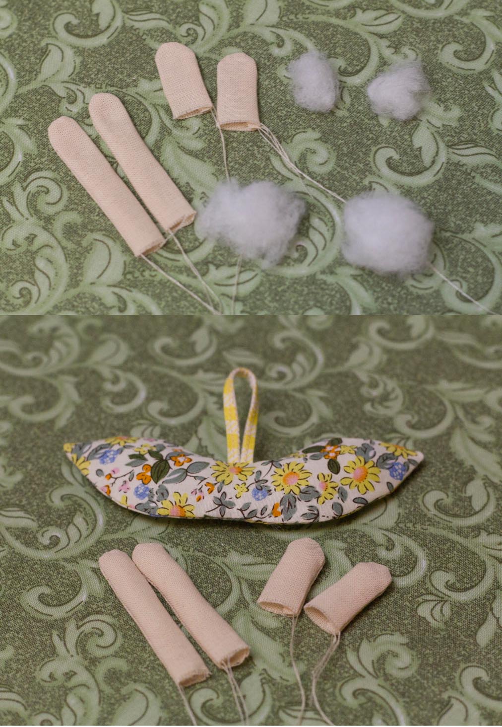 Выворачиваем ножки-ручки, синтепон отделяем равными шариками для рук-ног и набиваем. Крылья выворачиваем, отутюживаем и тоже набиваем слегка синтепоном, зашиваем отверстие потайным швом: